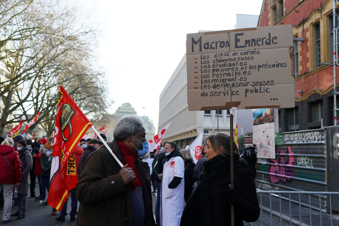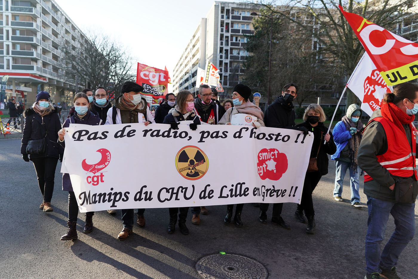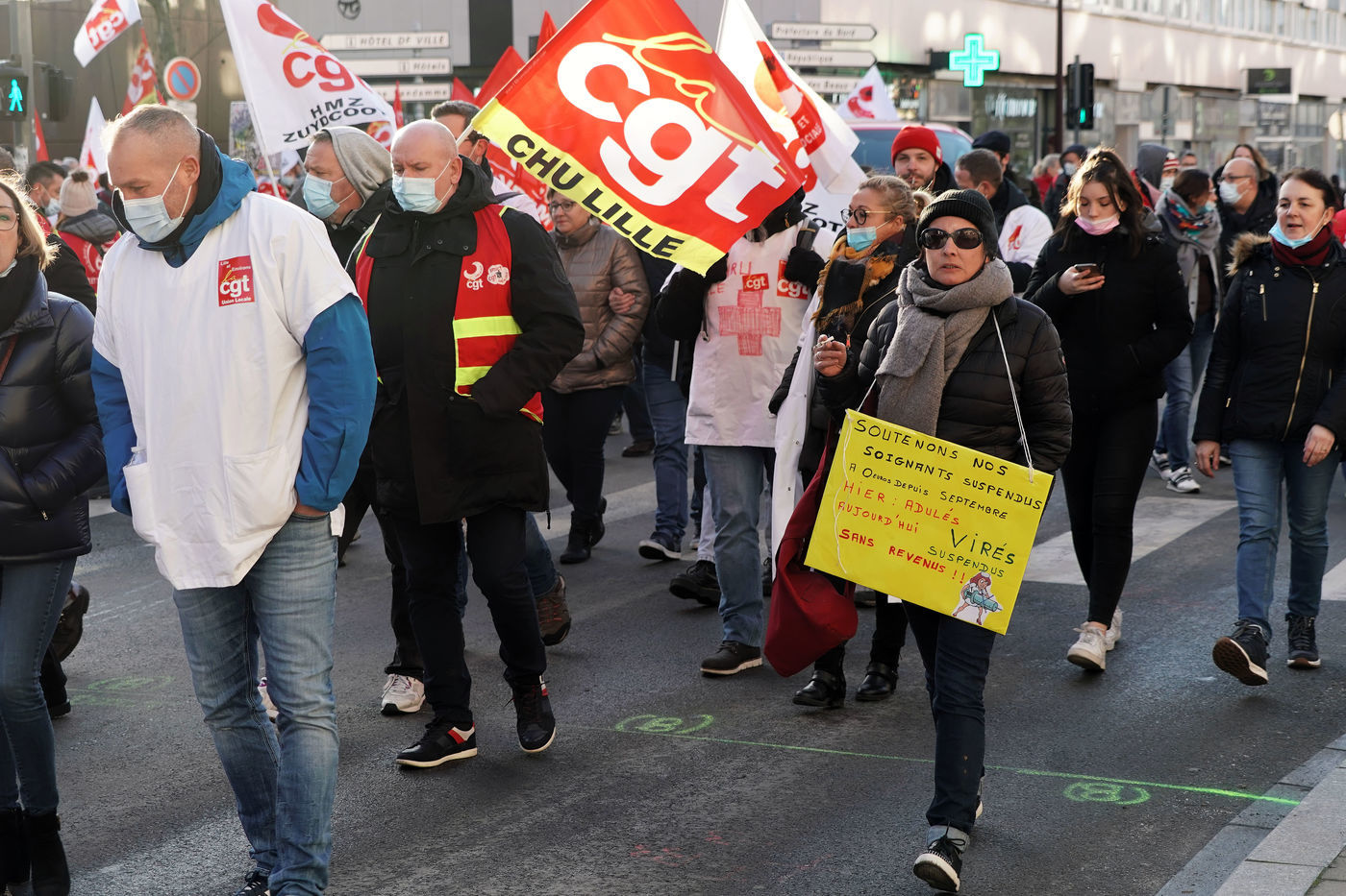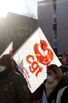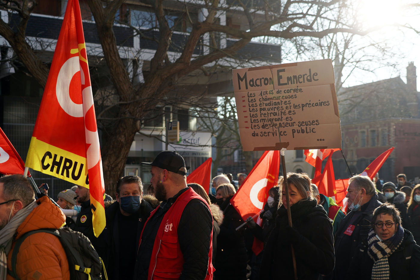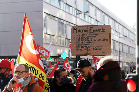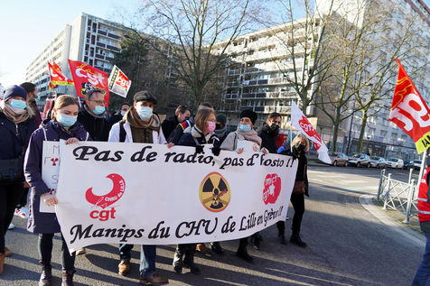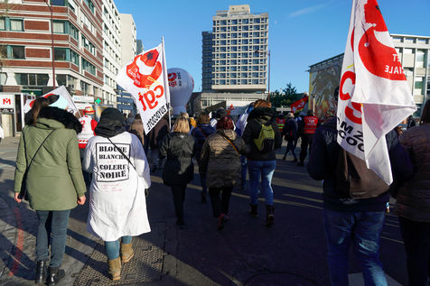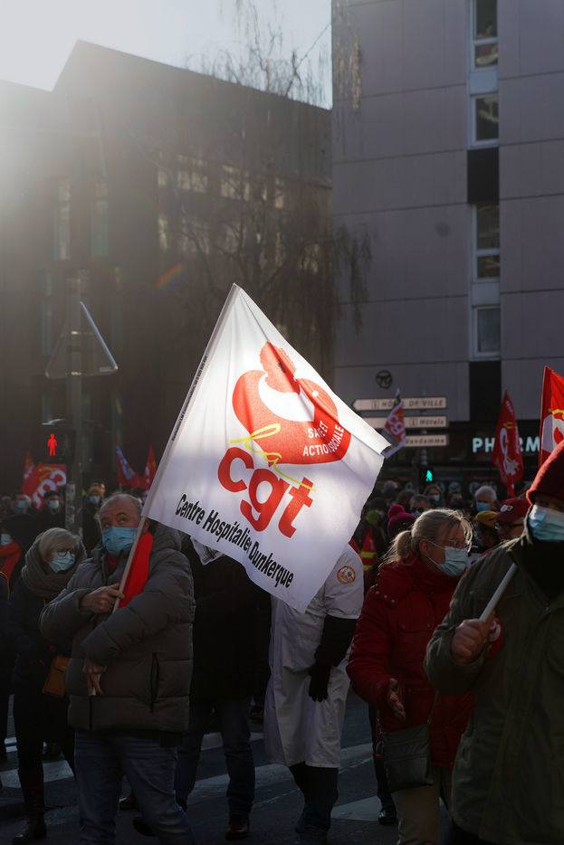 Des travailleurs de la santé manifestent à Lille, dans le nord de la France, le 11 janvier 2022, pour protester contre les conditions de travail et le niveau des moyens financiers des hôpitaux en France.