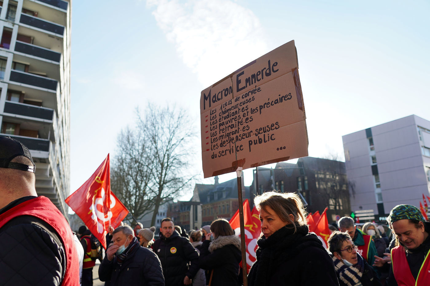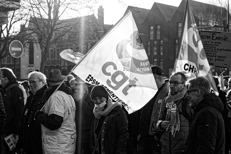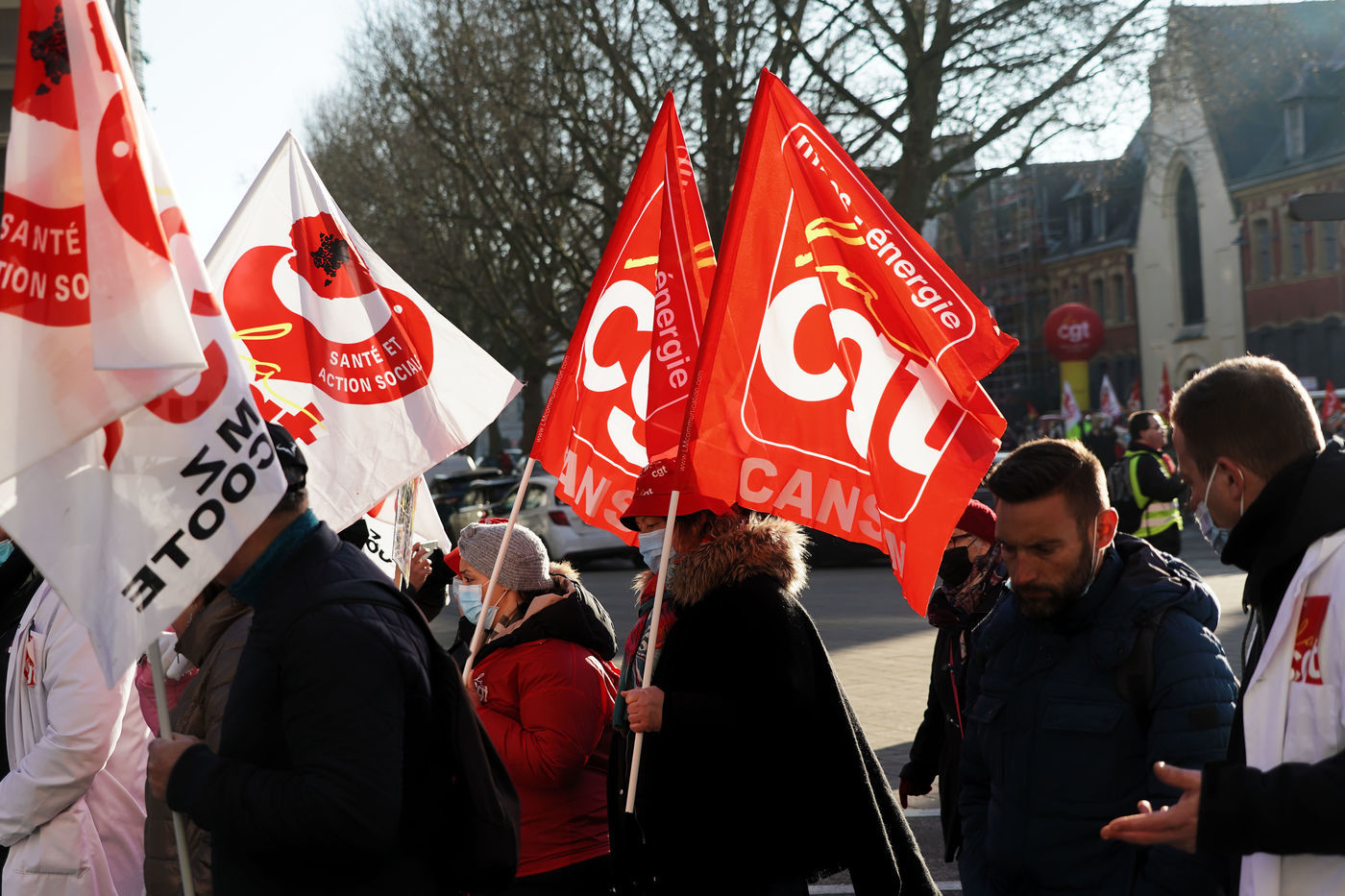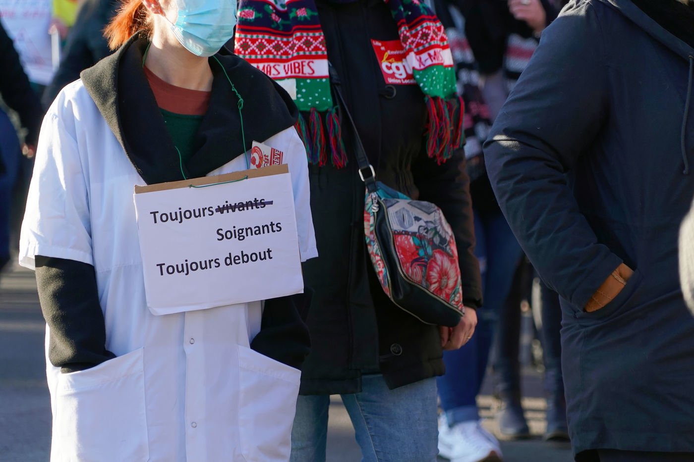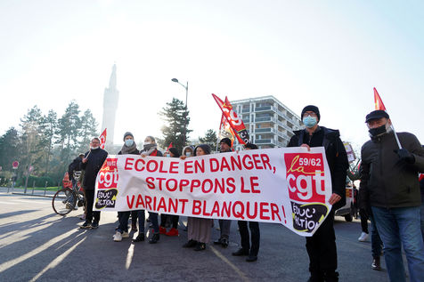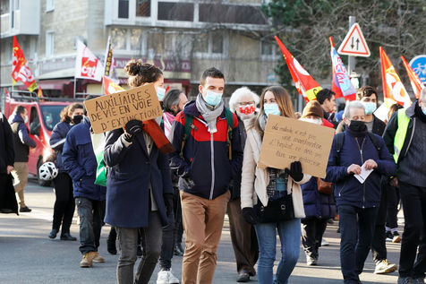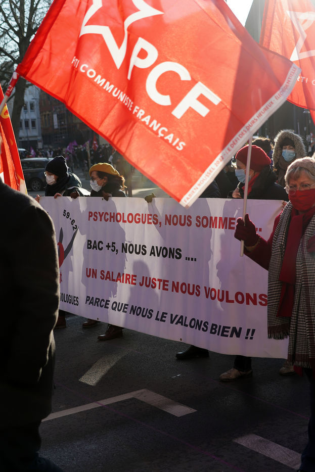 Des travailleurs de la santé manifestent à Lille, dans le nord de la France, le 11 janvier 2022, pour protester contre les conditions de travail et le niveau des moyens financiers des hôpitaux en France.