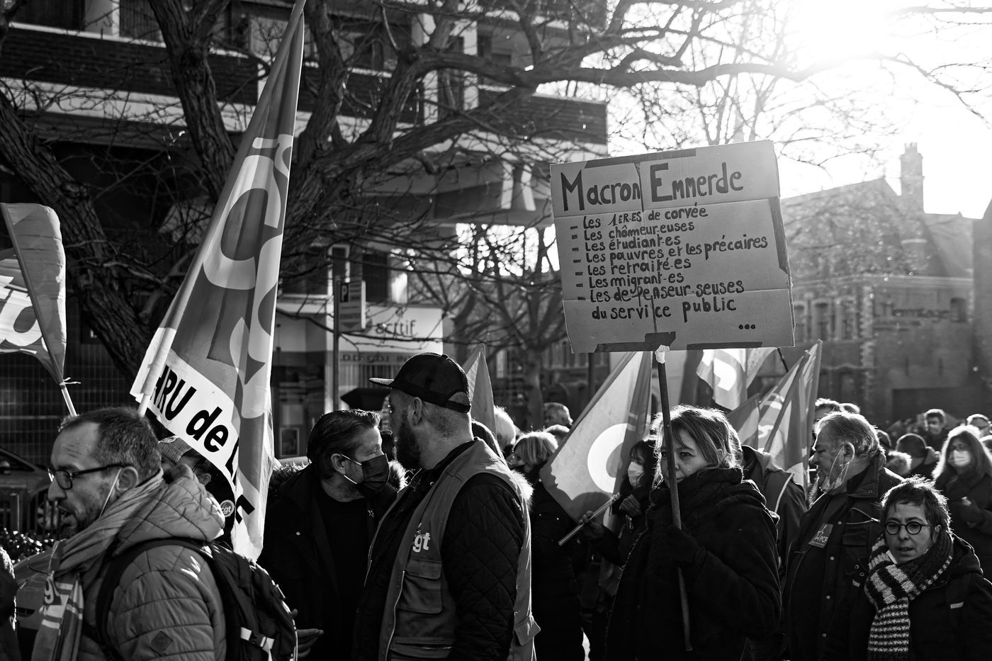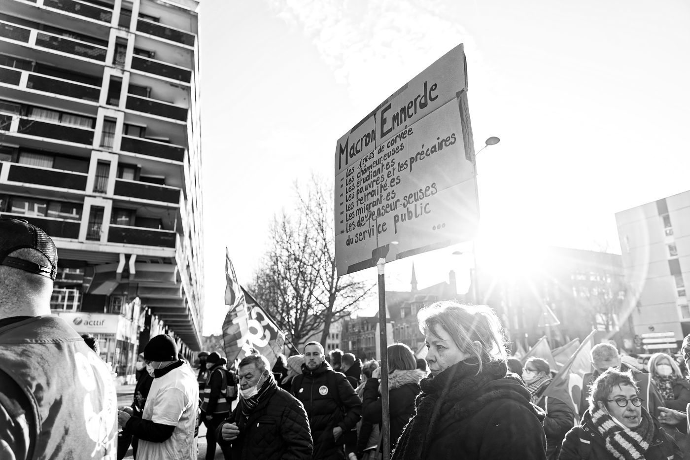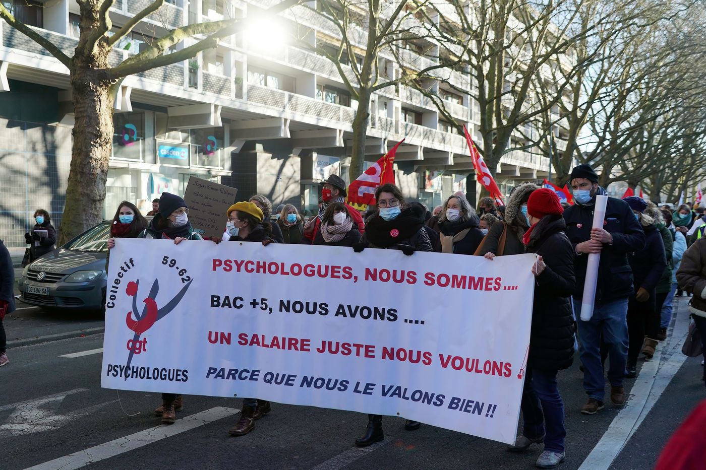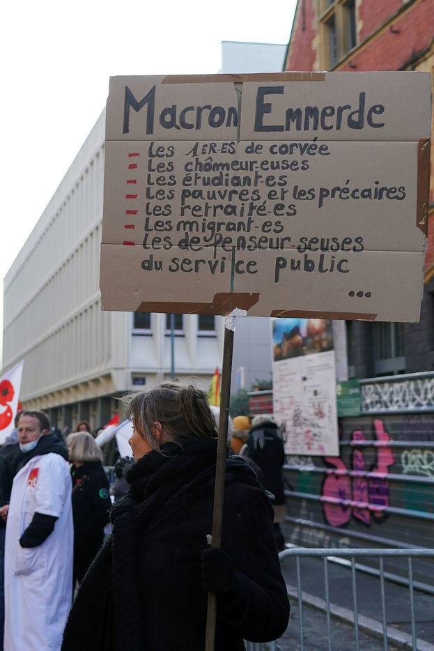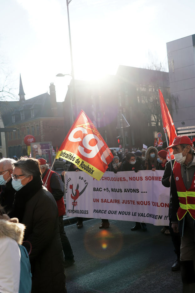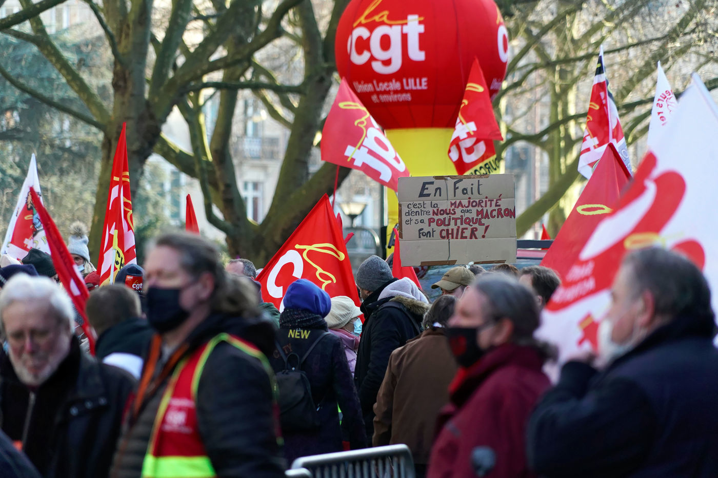 Des travailleurs de la santé manifestent à Lille, dans le nord de la France, le 11 janvier 2022, pour protester contre les conditions de travail et le niveau des moyens financiers des hôpitaux en France.