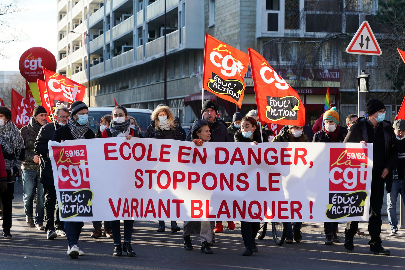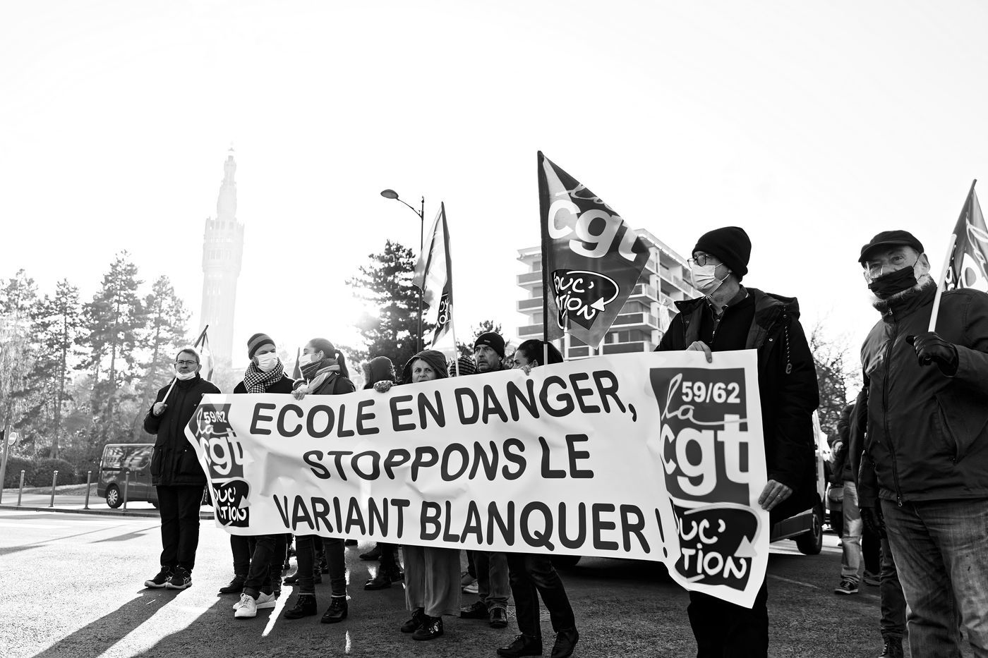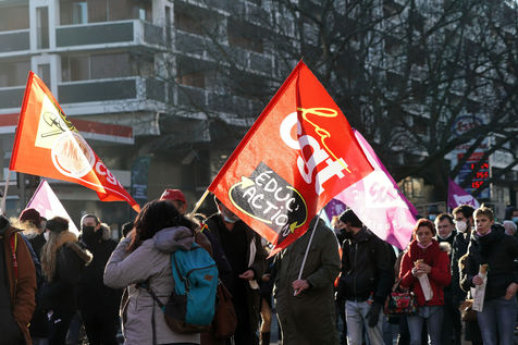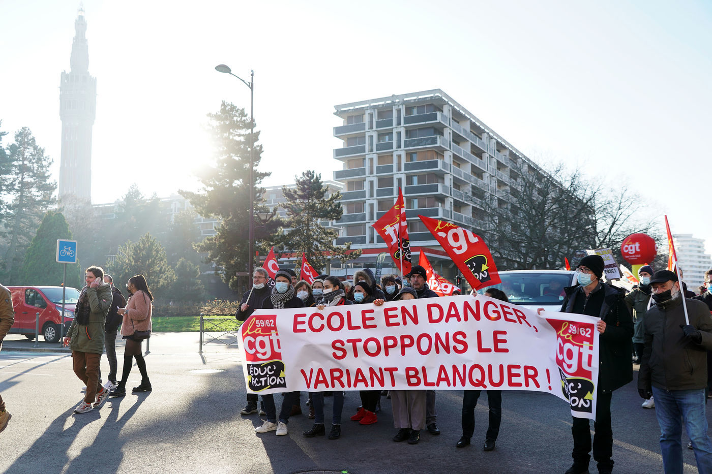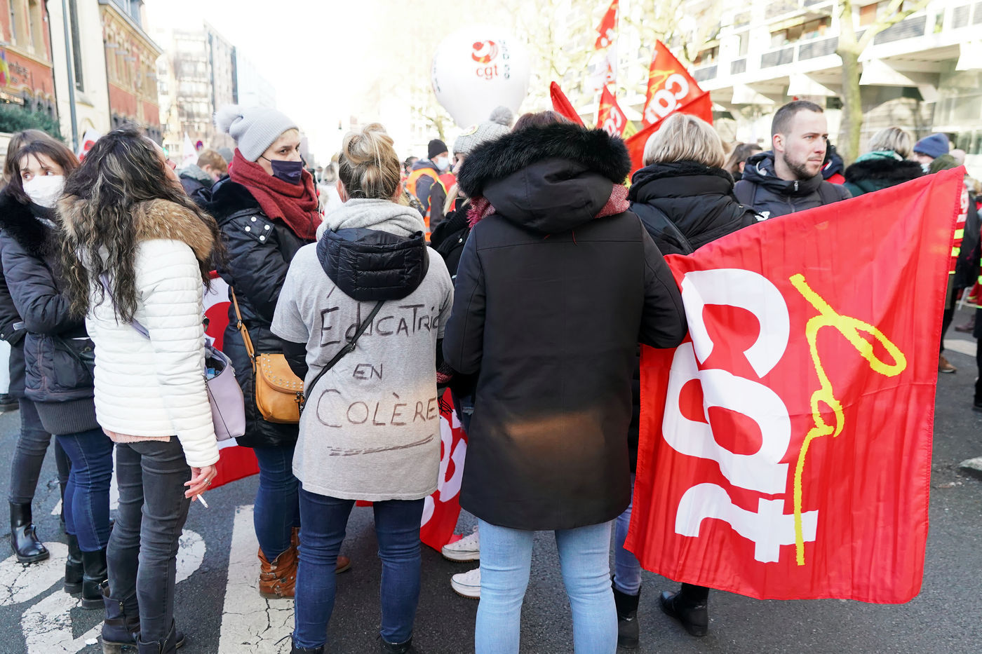 Des travailleurs de la santé manifestent à Lille, dans le nord de la France, le 11 janvier 2022, pour protester contre les conditions de travail et le niveau des moyens financiers des hôpitaux en France.