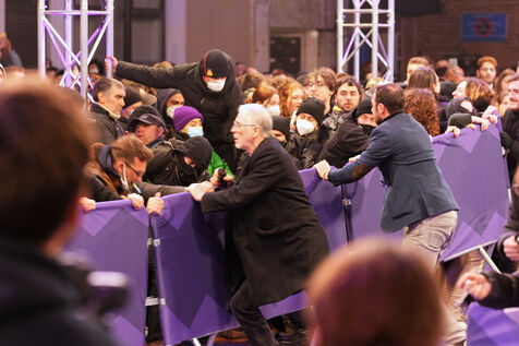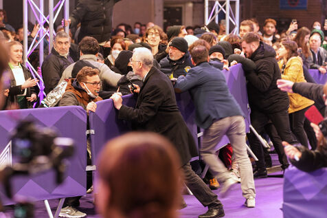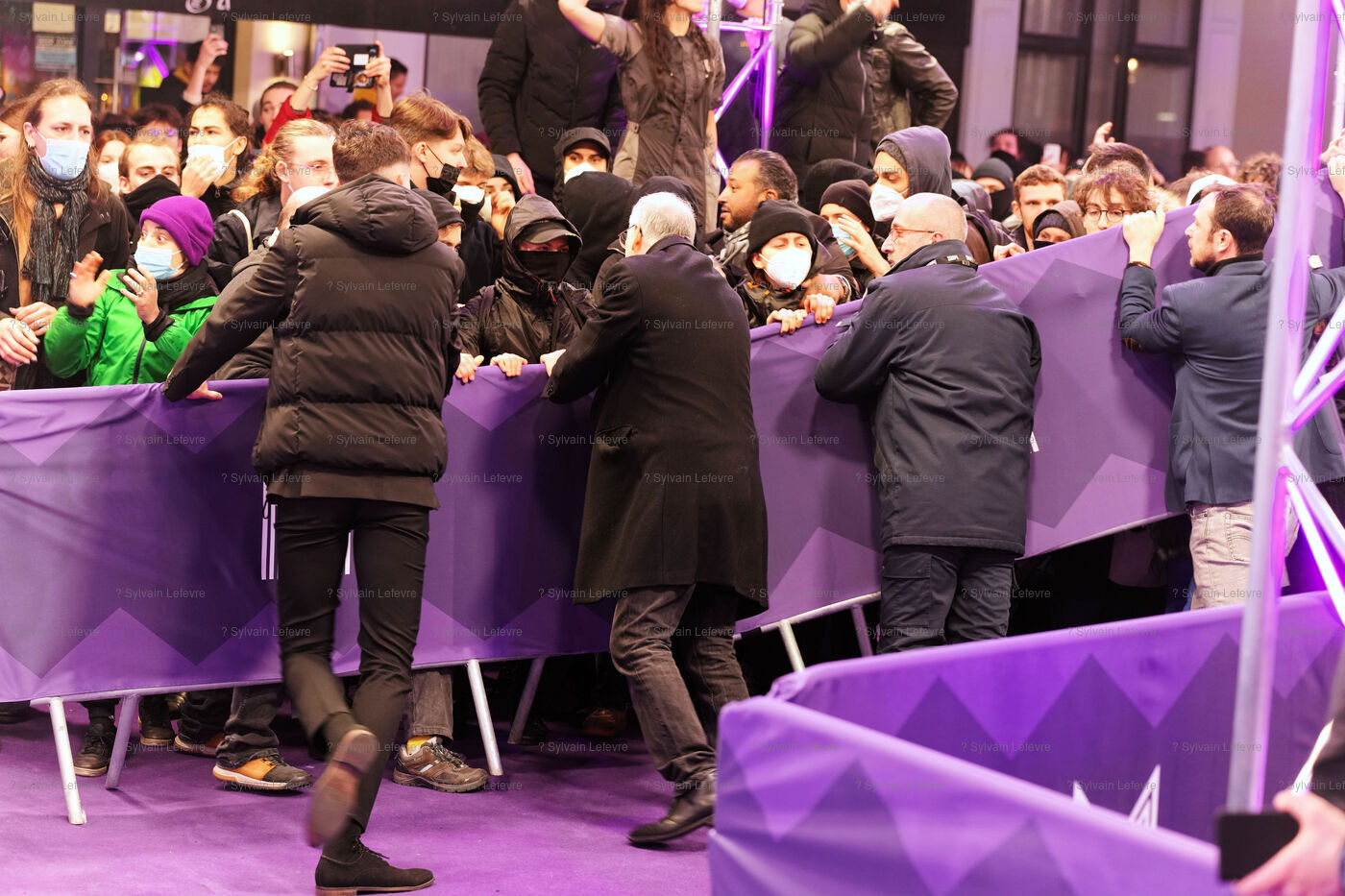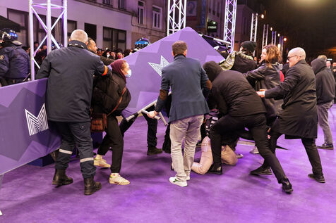 Protesters against the pension reform in France try to invade the violet carpet of the Series Mania festival, and are pushed back by security staff on March 21, 2023 in Lille, France.