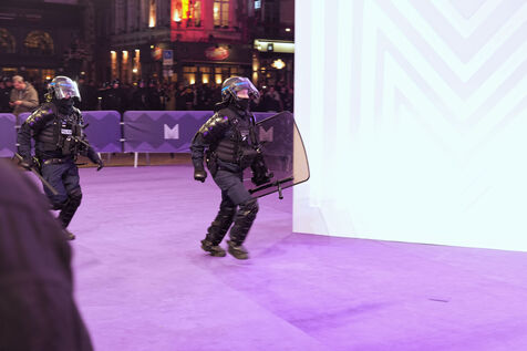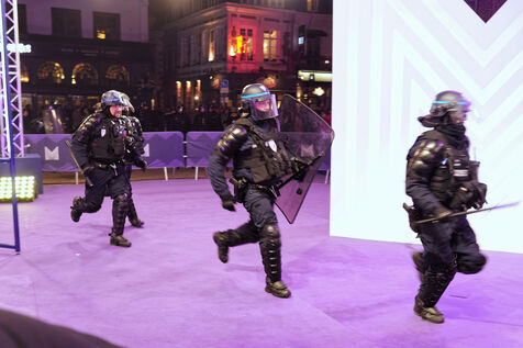 Des manifestants contre la réforme des retraites en France tentent d'envahir le tapis du festival Series Mania, et sont repoussés par le personnel de sécurité le 21 mars 2023 à Lille, France.