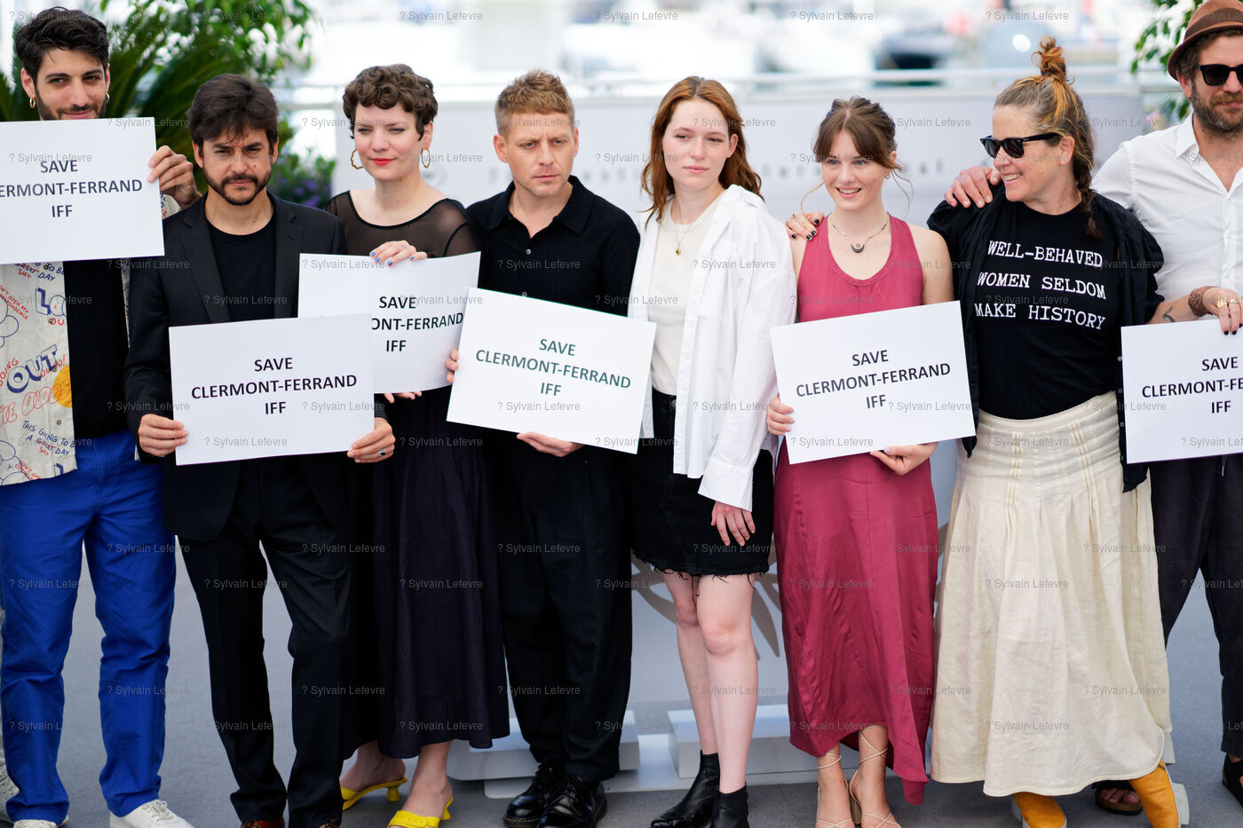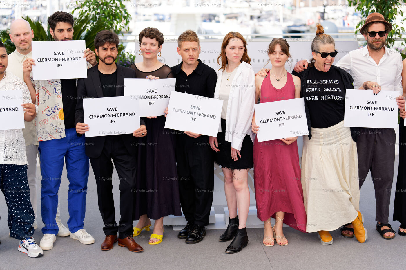 Les réalisateurs de courts metrages manifestent leur soutien au Festival du Film de Clermont-Ferrand (IFF) lors du photocall des "Réalisateurs de courts métrages" au Palais des festivals de Cannes dans le cadre du 76eme Festival du Film de Cannes, le 27 Mai 2023, Cannes, France