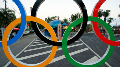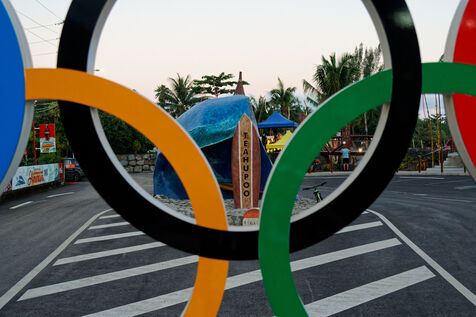 Olympic rings at Teahupo'o gateway on the road to the surf olympic site, in Tahiti Island, French Polynesia, on august 04, 2024