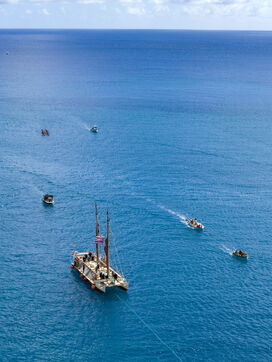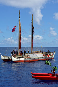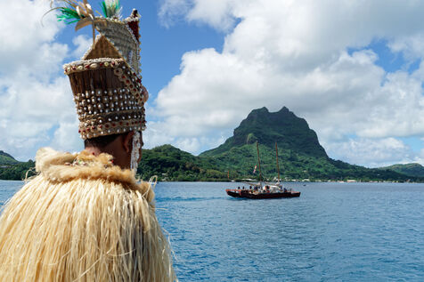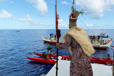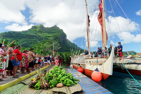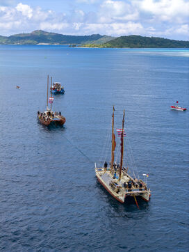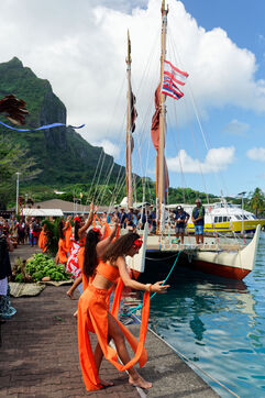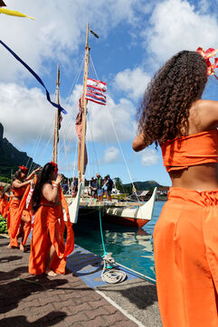 Cérémonie d'accueil des pirogues double traditionnelles polynésiennes Hokule'a - pirogue sans moteur - et Hikianalia - pirogue d'assistance - sur l'île de Bora Bora. Bora Bora est leur dernière étape en Polynésie Française dans le cadre du voyage Moananuiākea, 09 Aout 2025, Bora Bora, Polynésie Française