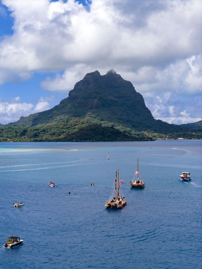 Welcome ceremony for the traditional Polynesian double-hulled canoes Hokule'a - a motorless canoe - and Hikianalia - a support canoe - on the island of Bora Bora. Bora Bora is their final stop in French Polynesia as part of the Moananuiākea voyage, on August 09, 2025 in BORA BORA, French Polynesia.