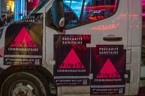 Manifestation pour la journée mondiale de lutte contre le SIDA, organisée par Act Up Paris. L'association militante de lutte contre le SIDA a appelé à la mobilisation : « Face à précarité sanitaire, riposte communautaire ». Place de la Bastille, le 1 décembre 2021.