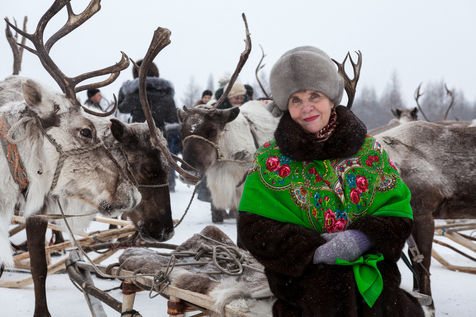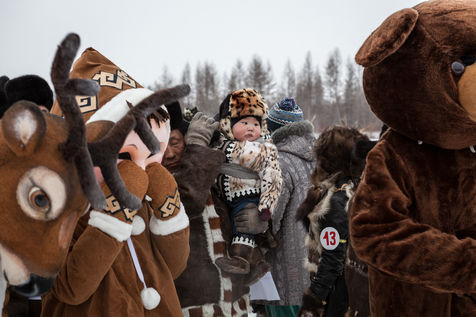 Les enfants russes gambadent en trimballant des ballons de baudruche en forme d'hélicoptère alors que les jeunes evenks fendent la foule, en tout sens, sur leurs rennes. Leurs petites bottes fourrées traditionnelles et leurs capuchons de fourrure tressautant au rythme de leur monture. Certains proposent même de faire un tour du campement contre quelques roubles.