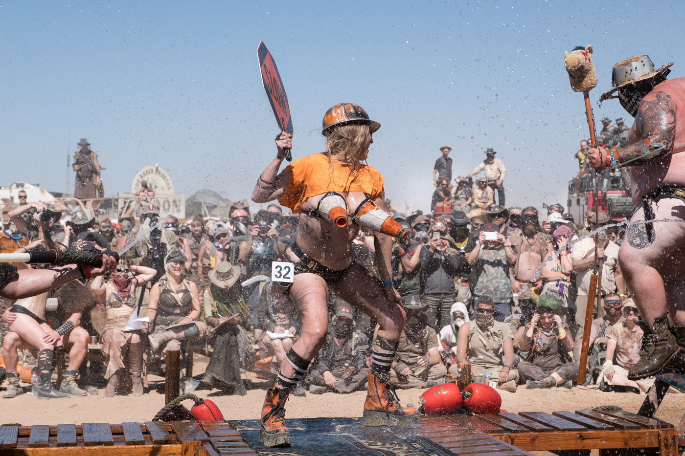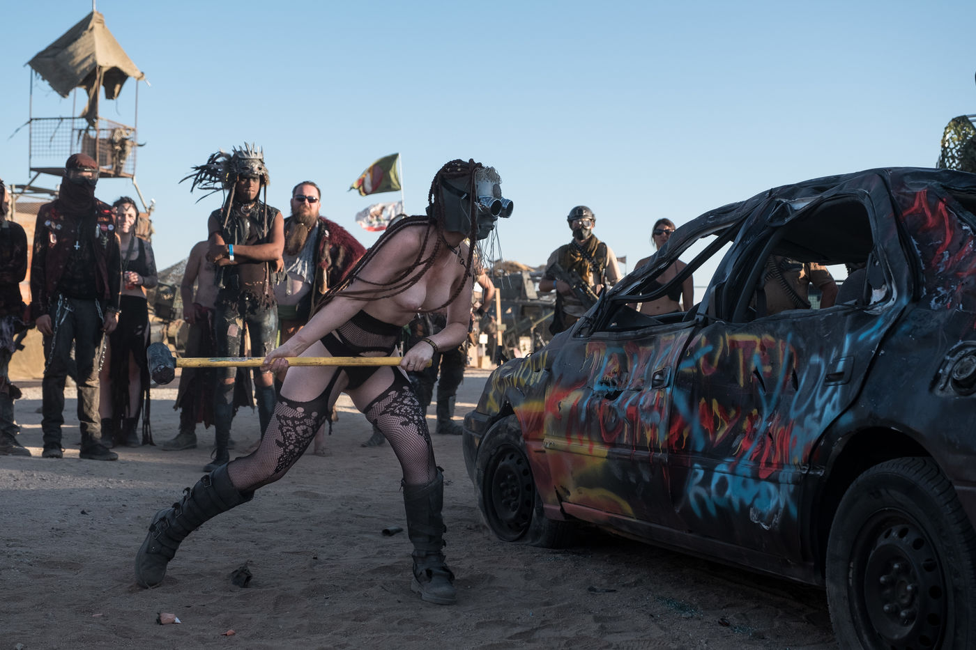 The permanent festival site is, ironically, between the Nevada nuclear test site - where from 1951 a total of 928 nuclear warheads were tested during the cold war - and Hollywood. It is vast and there is no shortage of entertainments. Many participants come together in tribe to build their own camp and offer crazy activities, such as remote-controlled robot fights or a sex toy race, down a metal slope, which you can bet on. Some places have become institutions like the Citadel where the amazing cars of Immortan Joe and his Warboys line up. Or the Deez scene, built on a wreck of a stranded boat, where the post-apocalyptic swimsuit competition takes place. The least we can say is that creativity is limitless in Wasteland. The costumes are all more extravagant than each other and each tribe having its personality, everyone can find its place. The recklest will probably join the tribe of Road Rash, kings of the party and organized theft, who simply stole a helicopter during the last edition.