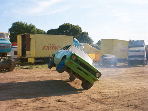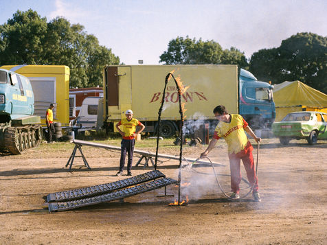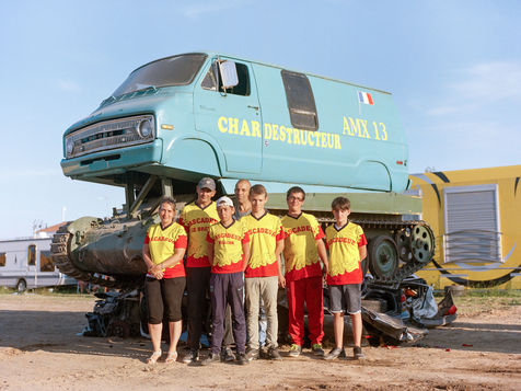 Les Hell drivers, c'est une affaire de famille. Sa femme, Carine, s'occupe de la buvette. Lui et son cousin, Fredo, font les cascades les plus techniques. Dérapage, Cabrage de camion, Equilibre sur deux roues... Et bien sûr, le clou du spectacle: l'écrabouillage de voiture. Leurs Monster trucks ont même des petits noms, Big Foot et L'américain. Le fils de Fredo, 16 ans, a appris à conduire lorsqu'il était enfant. Aujourd'hui, le visage impassible, il fait des tonneaux sur demande. Il s'élance sur la rampe, donne un brusque coup de volant et sa voiture tourne...une...deux...trois fois avant de se stabiliser. L'assemblée, qui retenait son souffle, peut respirer de nouveau. Comme dit Helmout: « c'est en forgeant qu'on devient forgeron ».