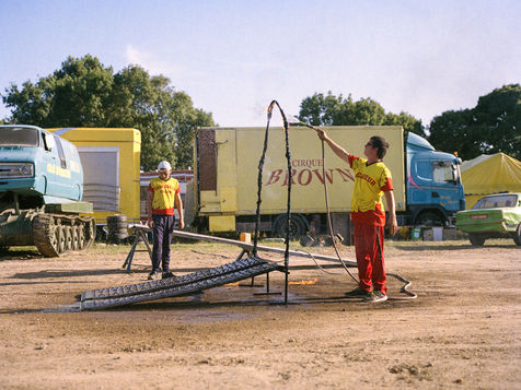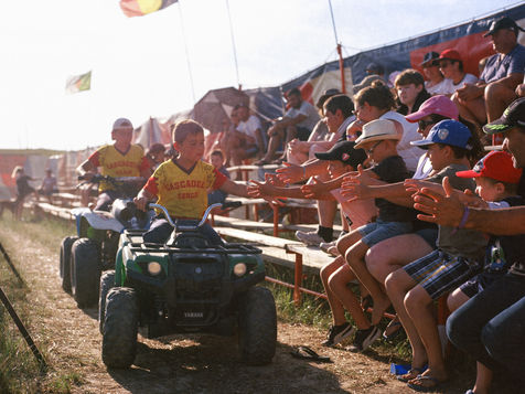 His three sons are a good illustration of his words, all participating in their own way. The youngest, Sergueï, barely 5 years old, has his mini quad bike backfire to sell flags to the public. While Killian, 14 years old, straddles his bike and jumps without hesitation into an ark of fire. Fewer and fewer stuntmen are learning the tricks of the trade from father to son. According to Fredo, there are only 25 stunt troops left in France, each with 10 to 15 people. They used to be itinerant, but with the rise in petrol prices and the lack of interest from tourists, it's becoming increasingly difficult to make ends meet. To save money, they decided not to travel this year.