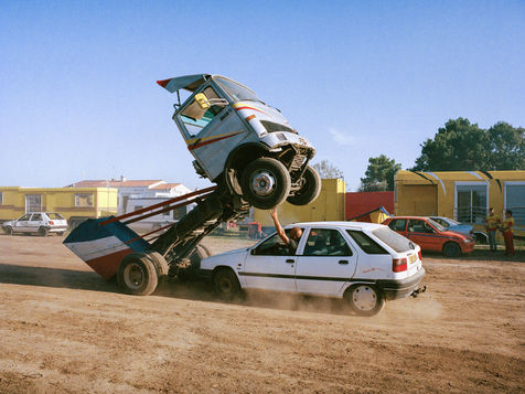 Suddenly, a giant on four wheels appears. At the wheel, Helmout, nicknamed "Le Breton", a stuntman for several generations, makes the engine roar. He joins the dirt track that hosts his daily show: the "Hell drivers" show. In the heart of the Vendée, during the whole summer, it is here that he performs with his troupe.