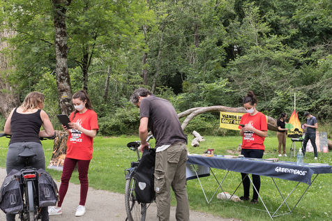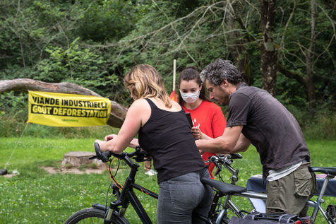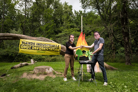 Action de Greenpeace dans un supermarché Auchan, le 3 juillet 2021 à Saint-Herblain (44800), en France . Six militants s'introduisent dans la grande surface pour coller des autocollants de flammes sur les vitrines de viande industrielle. Leur but: dénoncer l'importation massive de soja en France, responsable de la déforestation en Amazonie, pour nourrir les élevages de viande industrielle. Dans un second temps, ils informent et sensibilisent le public sur un stand installé dans le parc de la Chézine. Les passants sont ensuite invités à signer une pétition. Un barbecue tenu par deux militants portant des masques d'Emmanuel Macron et Jair Bolsonaro - président du Bresil - permet de faire brûler des arbres.