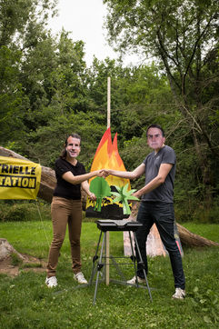 Greenpeace action in an Auchan supermarket, July 3, 2021 in Saint-Herblain (44800), France. Six activists break into the supermarket to stick flame stickers on industrial meat showcases. Their goal: to denounce the massive importation of soybeans into France, responsible for deforestation in the Amazon, to feed industrial meat farms. Secondly, they inform and educate the public on a stand set up in the Chézine park. Passers-by are then invited to sign a petition. A barbecue held by two activists wearing masks of Emmanuel Macron and Jair Bolsonaro - President of Brazil - allows trees to be burnt.