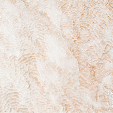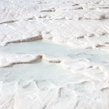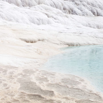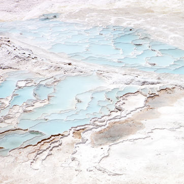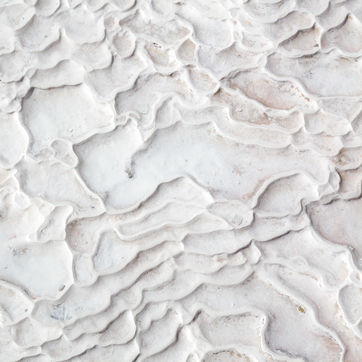 Méandres de calcaire, frissons opalins et dédales d'ivoire. Quelle virtuosité de la matière ! Chaque centimètre carré de cette avalanche de travertin est une ode à la texture. Et, comme des ovnis, des créatures bipèdes aux us et coutumes étranges se promènent sur ces formations de minerai.