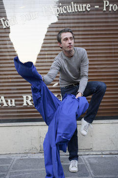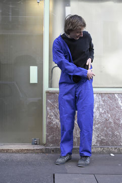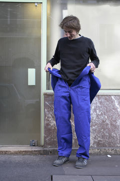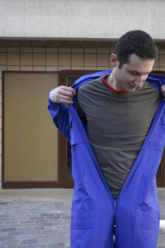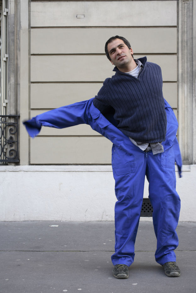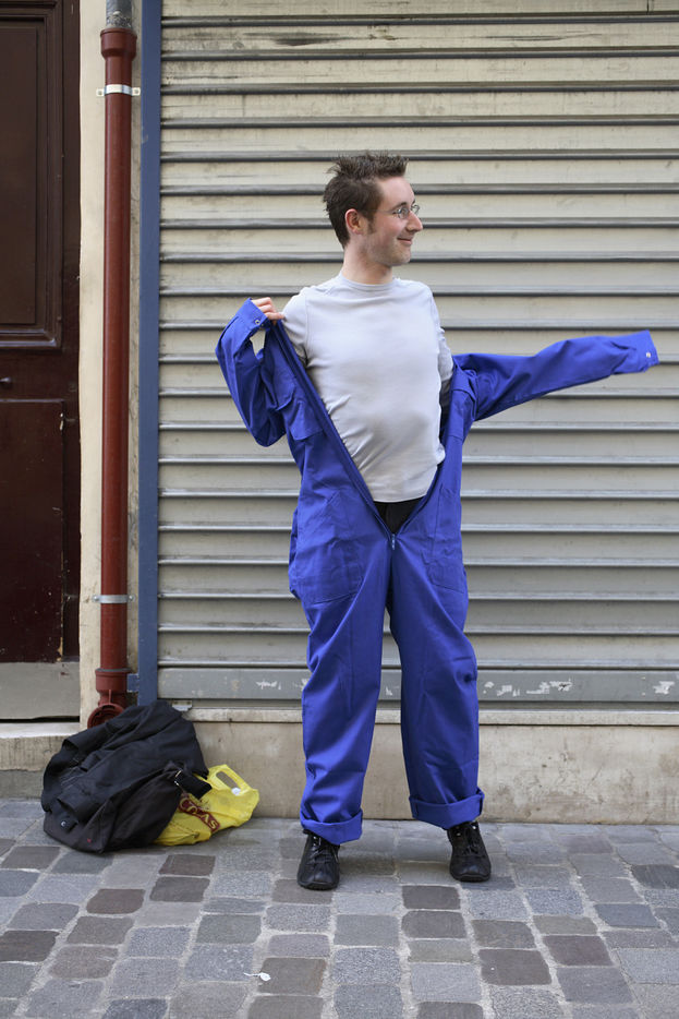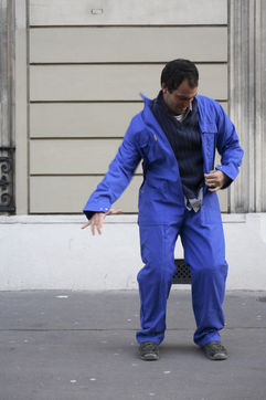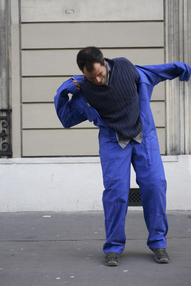 J'ai demandé à des inconnus dans la rue d'enfiler un BLEU DE TRAVAIL. La plupart n'en avait jamais porté. Si ce vêtement prend tout le corps, il ne s'agissait pas pour autant d'endosser la FONCTION et de jouer à l'ouvrier, mais plutôt de se prêter à un exercice CHORÉGRAPHIQUE. Ce travail réalisé pour l'illustration d'un article du journaliste Nicolas KSSIS pour le mensuel Regards, paru en avril 2007.