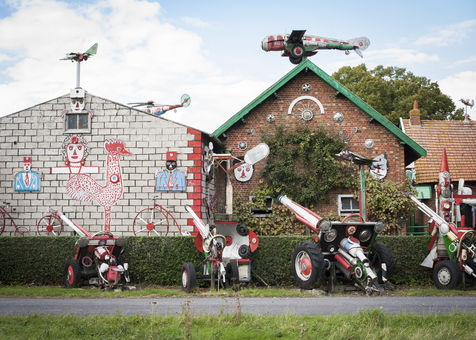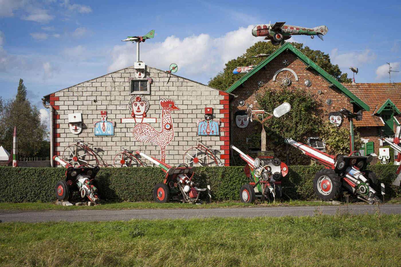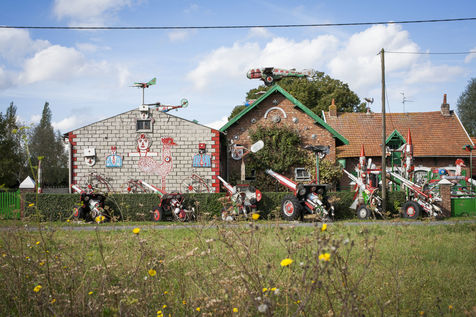 De l'autoroute qui mène à Calais, on peut apercevoir une surprenante installation : un toit hérissé d'avions et six ou sept canons appuyés contre une haie bien taillée. Pour s'en approcher, il faut traverser une méchante zone industrielle. Le ciel est lourd et nuageux. Des champs humides s'étendent à l'infini. Des tracteurs dorment devant des granges. A l'intérieur des rares bâtisses en briques rouges, des agriculteurs sont rentrés déjeuner. Un garagiste s'affaire dans son entrepôt. Les deux frères de « la ferme aux avions », il les connaît. Leur maison est située un peu à l'écart, au bout d'une impasse qui débouche sur l'autoroute. Le bruit continu des moteurs vrille le cerveau. Là, en plus des avions et des canons, on découvre des fusées pointées vers le ciel, ornées de l'inscription NASA, ainsi qu'un énorme char d'assaut planté au milieu du jardin. Un arsenal militaire inoffensif fait de pièces de machine à laver, d'enjoliveurs, d'extincteurs, de radiateurs et de roues de tracteurs. Des figurines ont été découpées dans de fines planches de bois. Etranges hôtes que ces têtes de soldats accrochées au mur : « Un officier français, un tirailleur marocain et un autre sénégalais », précise le frère de l'auteur. « Beaucoup disent qu'on est des belligérants, alors que ce n'est pas vrai. »