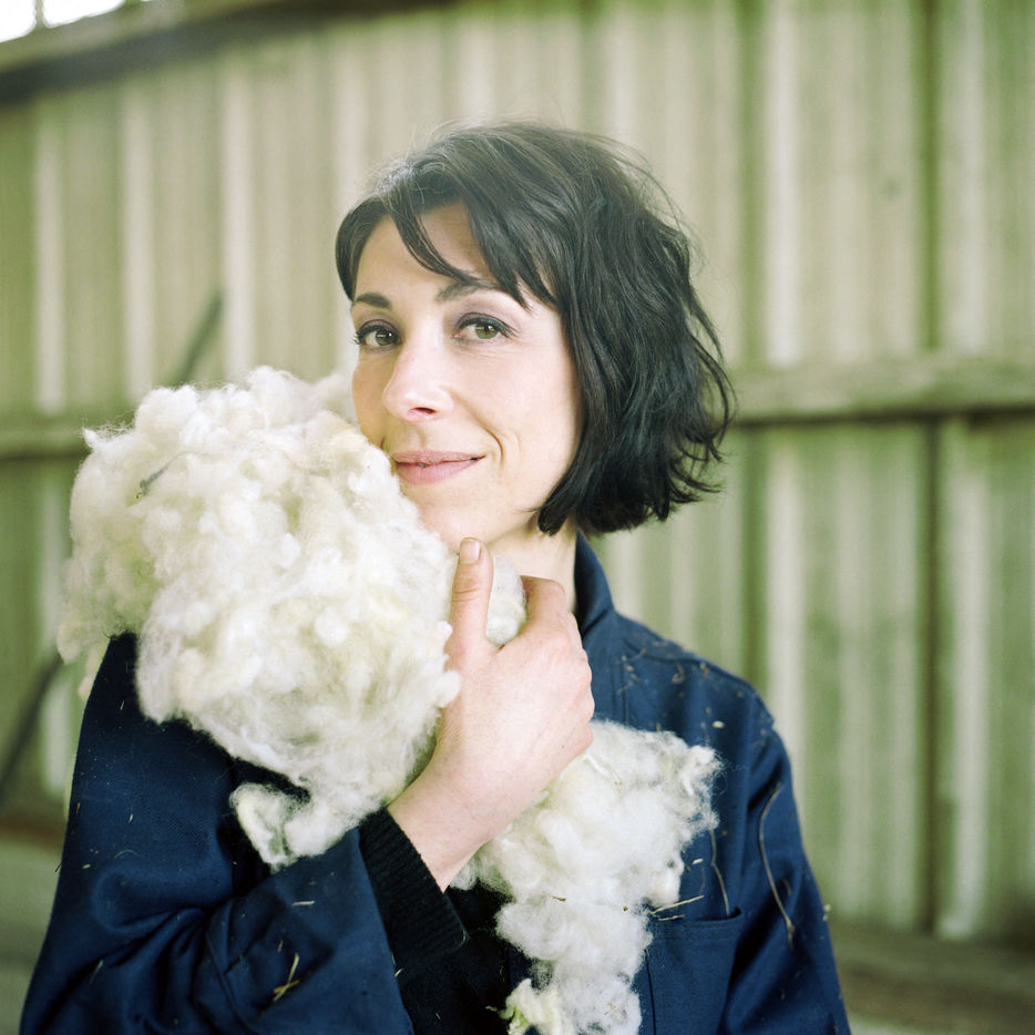 Stephanie Maube, ancienne graphiste a Levallois-Perret, Stéphanie est devenue eleveuse d'agneaux et de mouton. Ici elle pose avec sa laine de mouton sur l'epaule, dans sa bergerie a Saint-Germain-sur-Ay (Manche) en fevrier 2019.