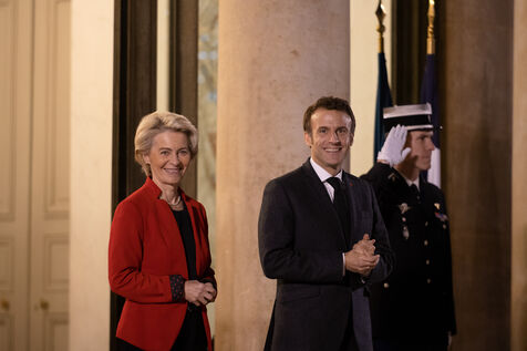 Reception par Emmanuel Macron d'Ursula Von der Leyen et de Jonas Gahr Store à l'Elysée pour un diner de travail précedant la conférence Solidaires du peuple ukrainien.