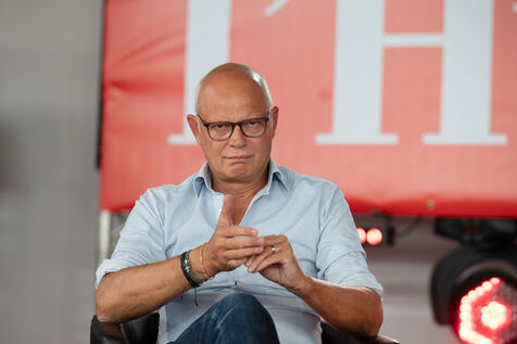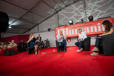 Politique à la fête de l'Humanité, Marine Tondelier, secrétaire nationale d'Europe Ecologie les Verts, Fabien Roussel secrétaire national du Parti Communiste Francais, ainsi que le débat entre Edouard Philippe et Fabien Roussel