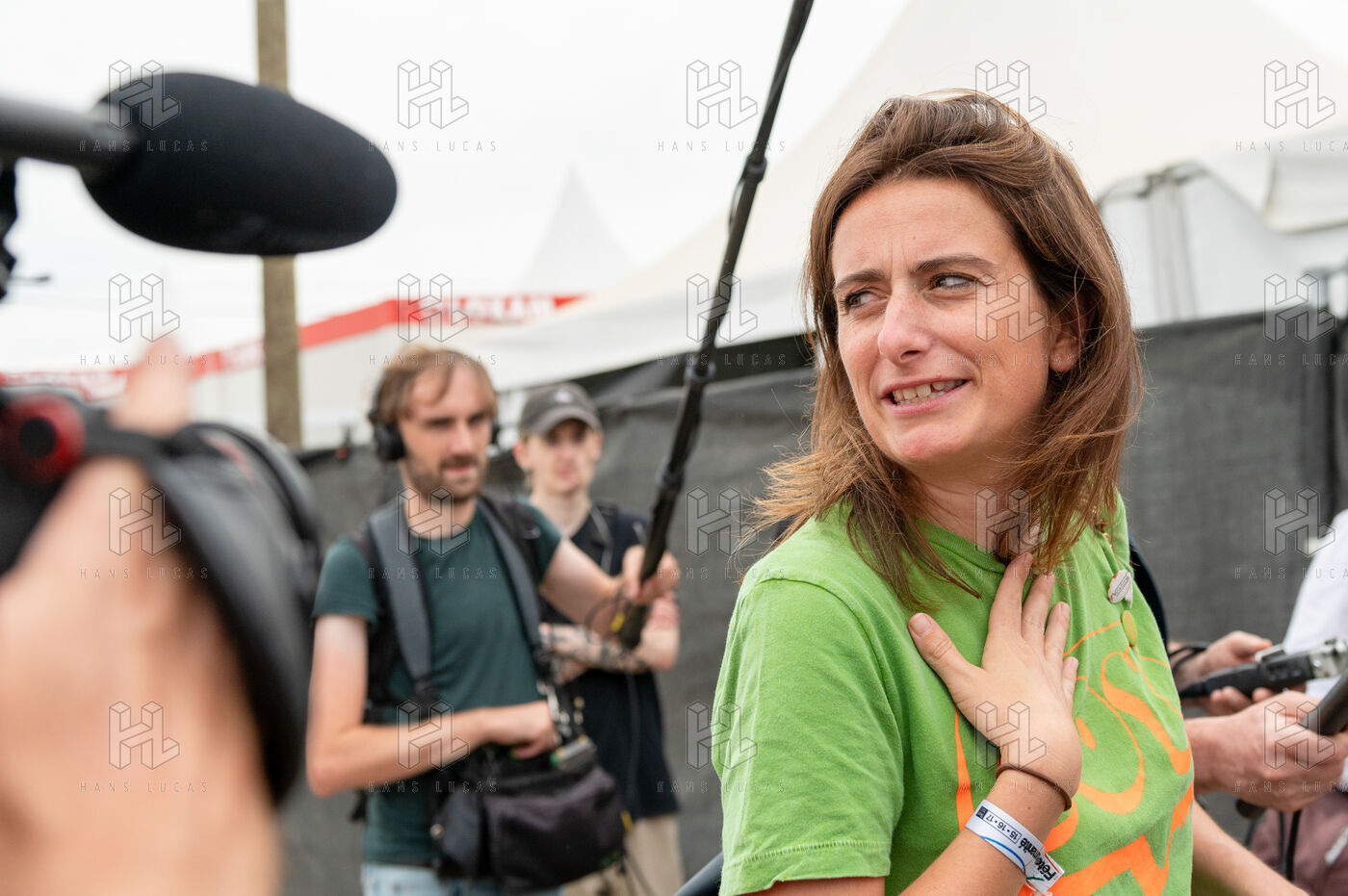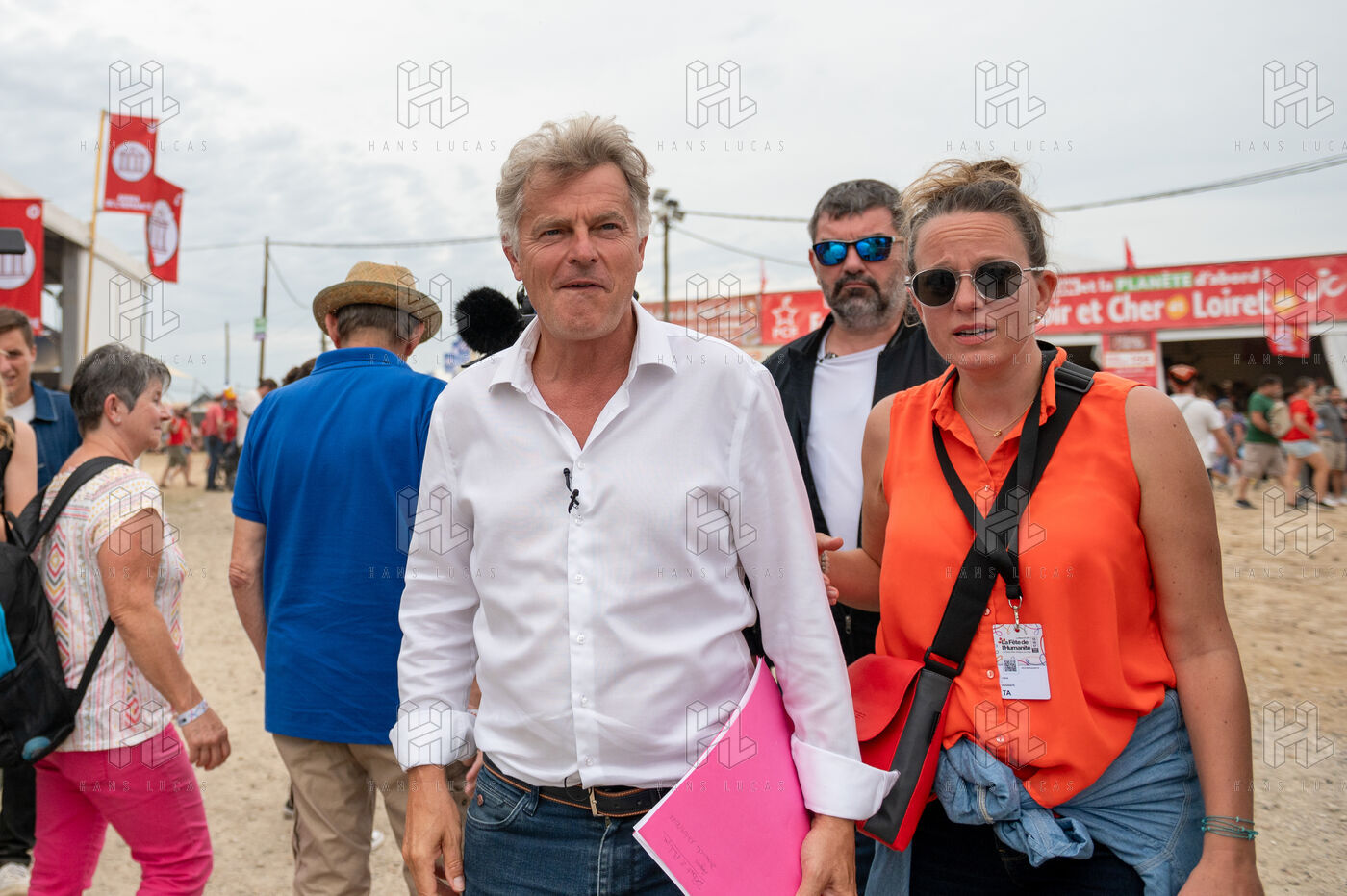 Politics at the fête de l'Humanité, Marine Tondelier, national secretary of Europe Ecologie les Verts, Fabien Roussel national secretary of the Parti Communiste Francais, and the debate between Edouard Philippe and Fabien Roussel