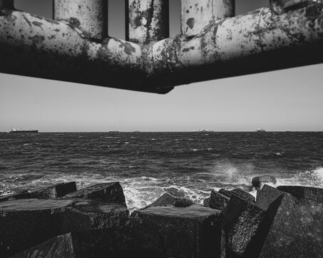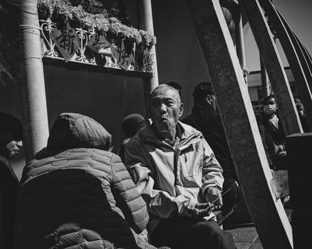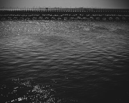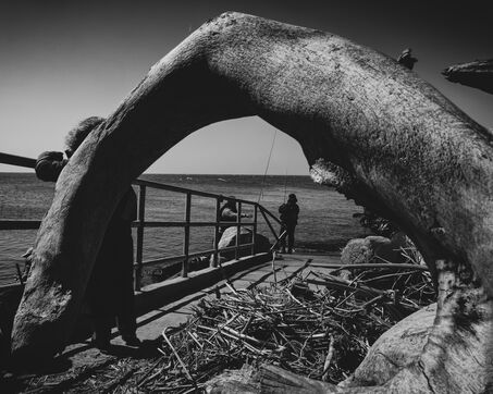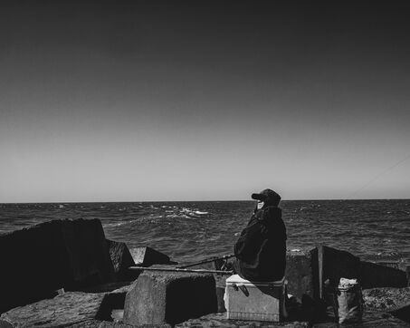 In Longjing, fishermen gather near the outflow of the thermal power plant. The wind lashes their faces, churning short, restless waves. Their fishing rods bend under the gusts, lines carving taut arcs in the air. Stray dogs sleep on the ground, indifferent to the commotion. Further away, wind turbines turn, massive and unshaken, their arms reaching into the vast grey sky.