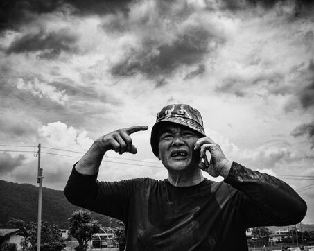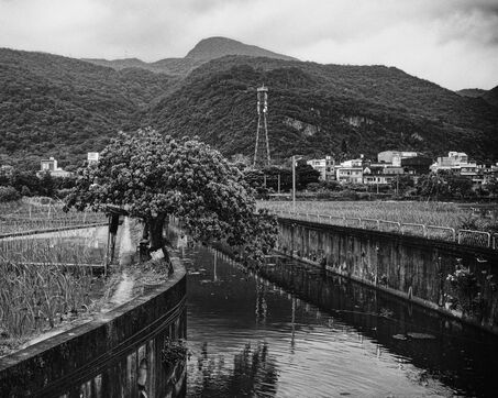 The rice fields split open beneath the pale sky, scored by slow-moving canals where the water whispers, and the mountains, massive and still, keep watch like beasts lying in the mist.