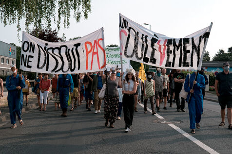 Action in front of the Chamber of Agriculture by environmental activists in support of the Earth uprisings which have staged the dissolution of the "co-management" of the State and the FNSEA. After raising slogans written on toilet paper, they dissolved the slogans in basins of water, then threw the wet paper at the Chamber of Agriculture. Tours 27/06/2023.