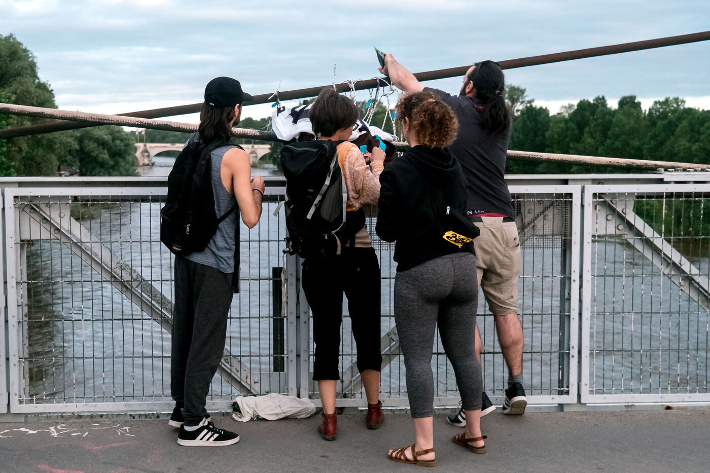 Accrochage d'une banniere Front Ecologique Social Populaire par des activistes climat, sur le pont de fil, en soutien au Nouveau Front Populaire. L'accrochage a ete interrompu par la police municipale qui a releve les identites des activistes. Ils ont aussi releve mon identite pour les avoir pris en photo.. Tours 28/06/2024. Photographie par Sebastien PONS / Hans Lucas