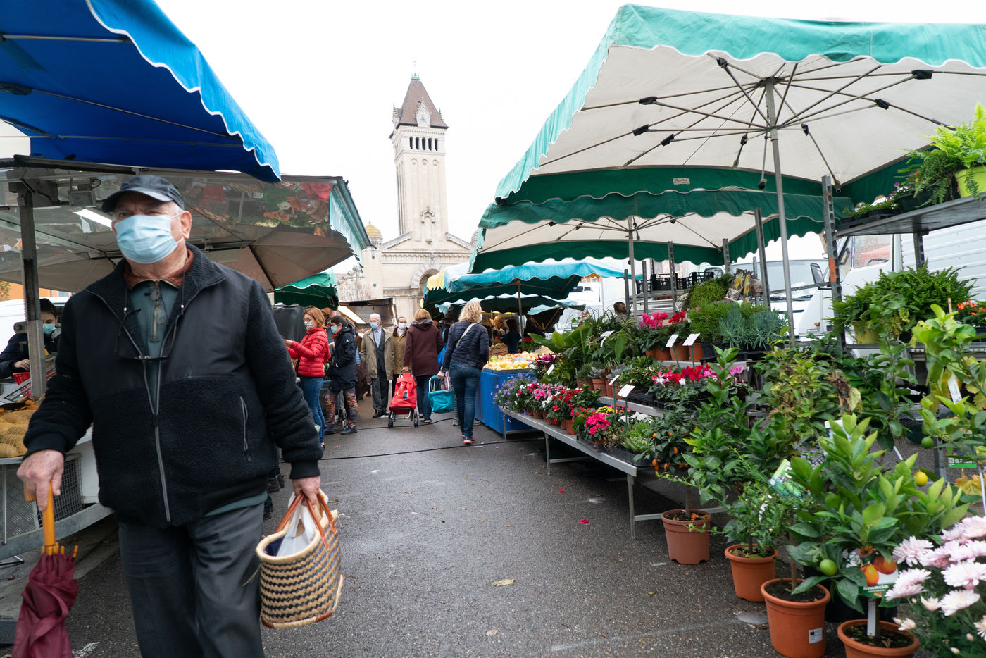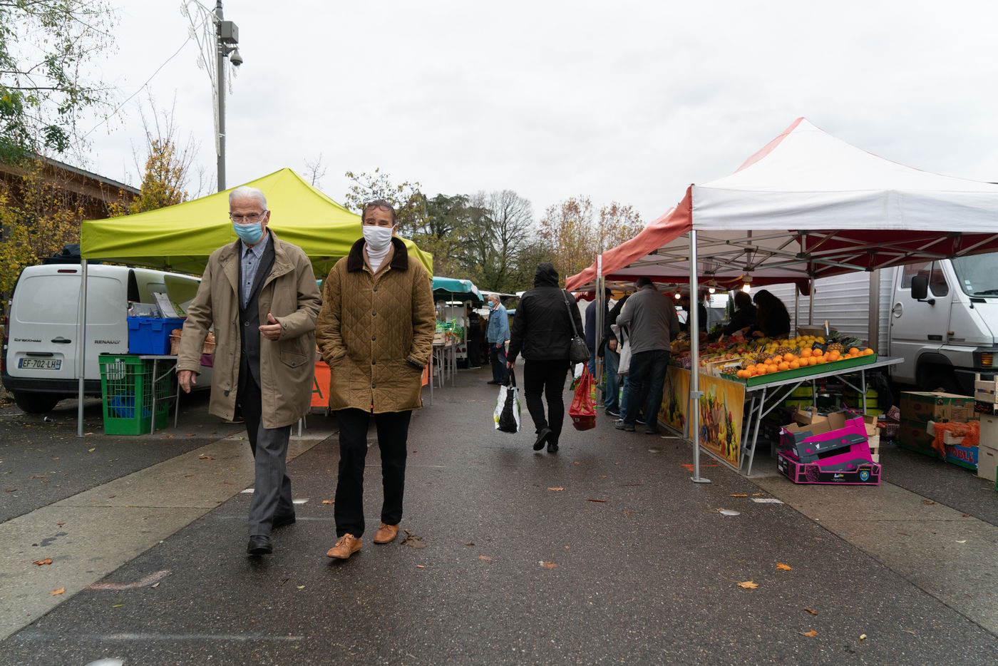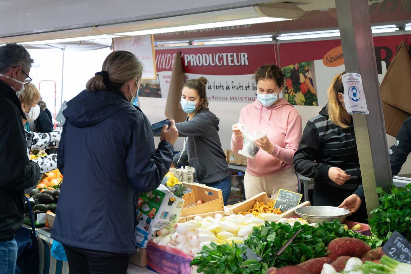 Pendant le confinement mise en place pour limiter la propagation du coronavirus (2ième vague), les marchés restent ouverts. Comme dans tout le département du Rhône, le port du masque y est obligatoire.