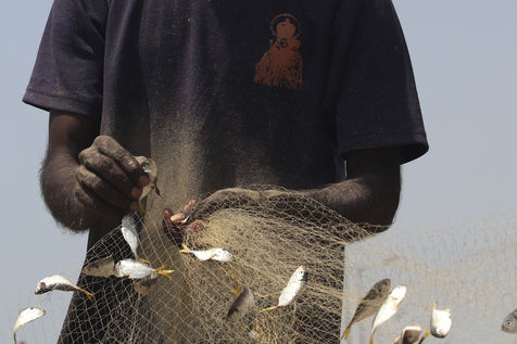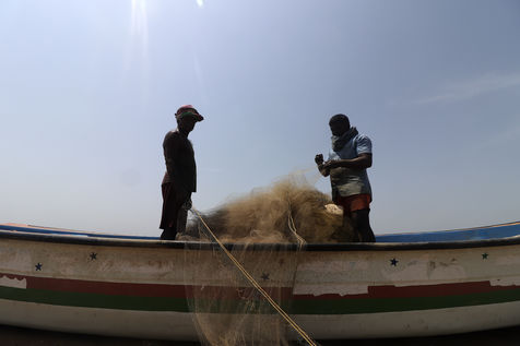 India, Chennai, 2021-05-29. Fishermen collect fishes from an early morning catch during the complete lockdown as a preventive measure against the COVID-19 coronavirus, in Chennai.