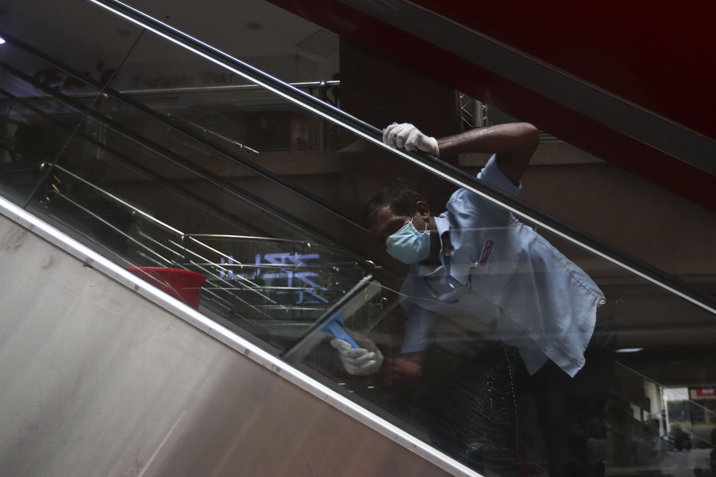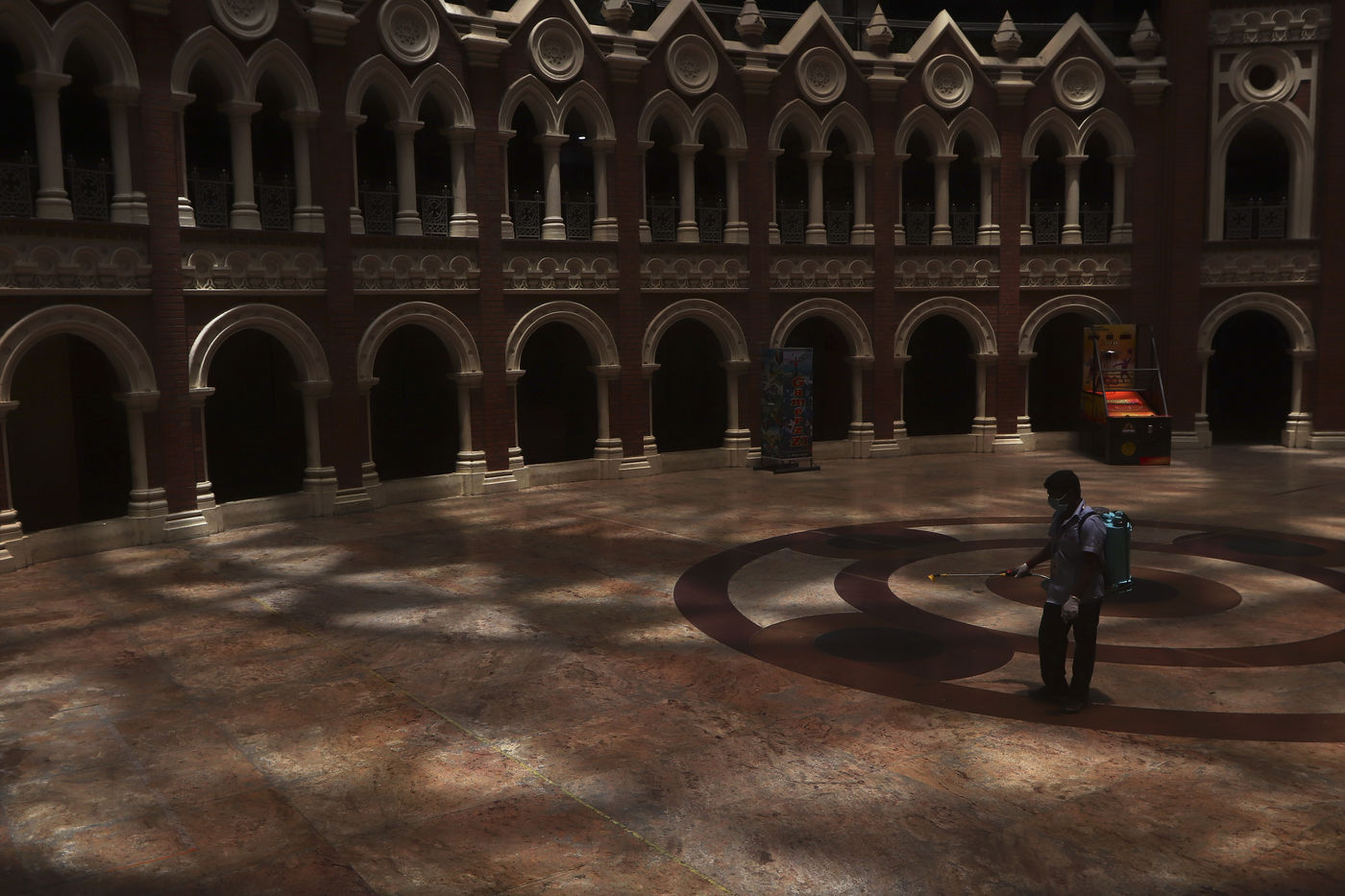 Inde, Chennai, 2021-06-27. Les employes nettoient un centre commercial avant sa reouverture a Chennai, le gouvernement de l Etat ayant autorise l ouverture des centres commerciaux et des espaces commerciaux a partir de demain a Chennai. Photographie de Sri Loganathan Velmurugan / Hans Lucas.