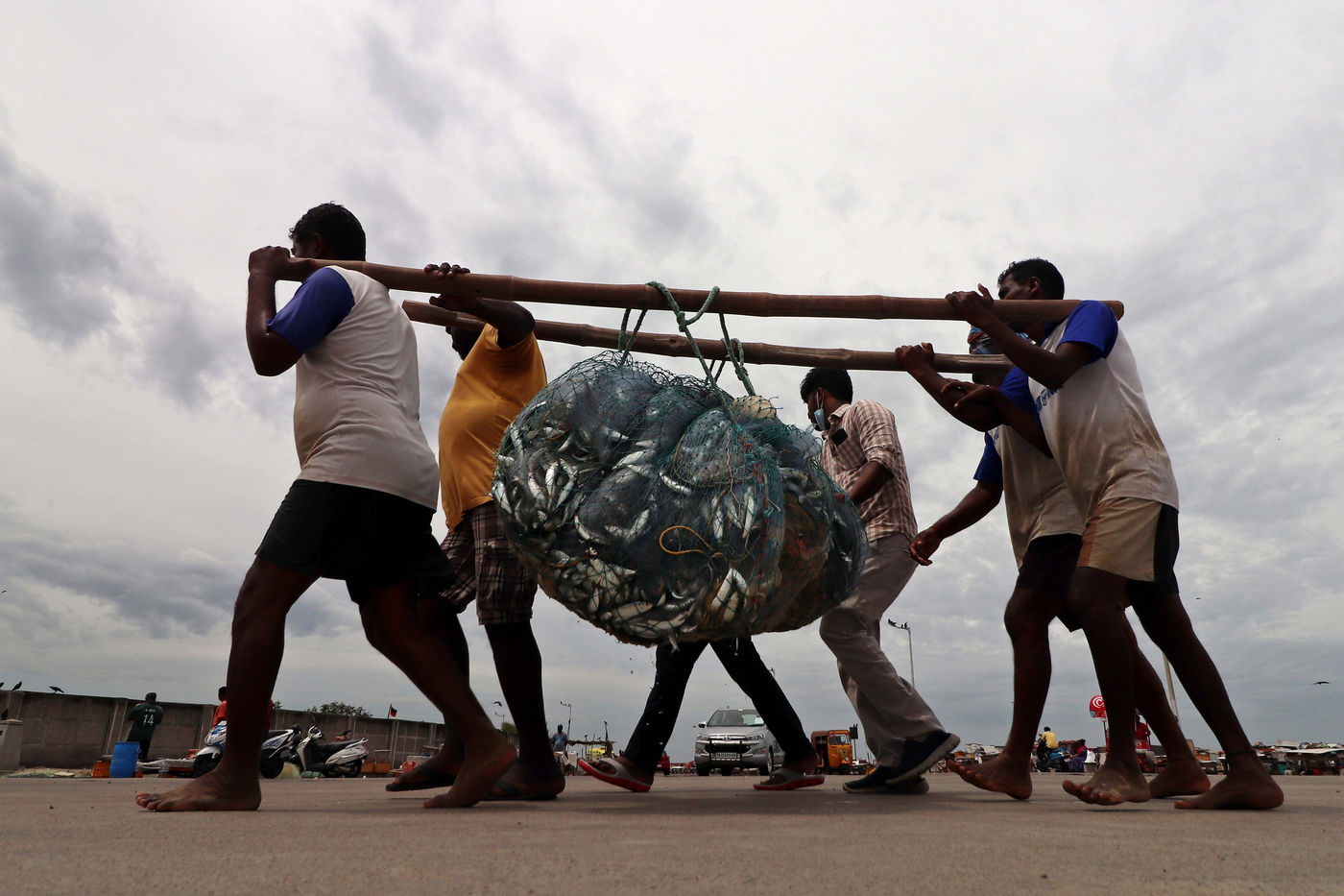 Inde, Chennai, 2021-07-09. Des pecheurs indiens ramassent du poisson d une prise du matin a Chennai. Photographie de Sri Loganathan Velmurugan / Hans Lucas.