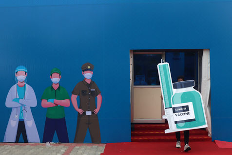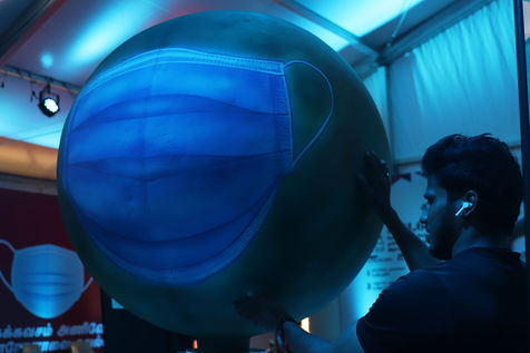 India, Chennai, 2021-07-30. The display materials of a Covid-19 coronavirus awareness exhibition is being set up by employees in Chennai. Photograph by Sri Loganathan Velmurugan / Hans Lucas.
