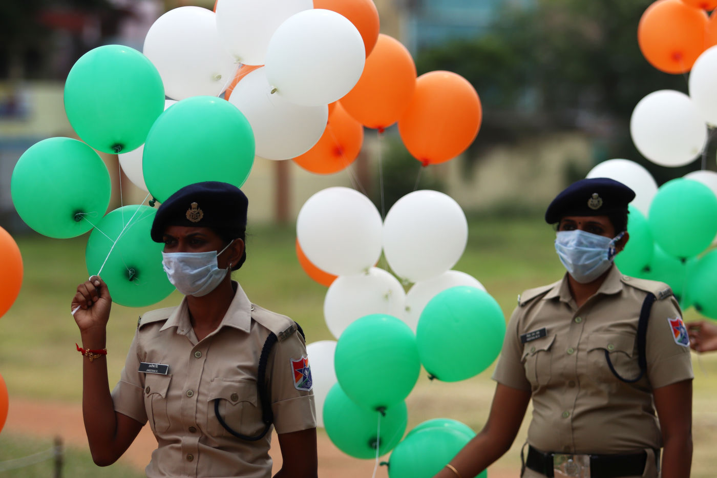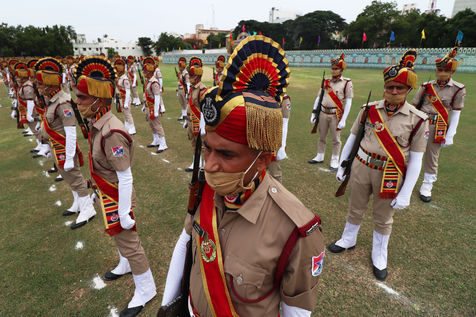 India, Chennai, 2021-08-15. Cadets of the Railway Protection Force (RPF) take part in a parade during the celebrations of India's 75th Independence Day in Chennai. India celebrates its anniversary of Independence from British colonial rule on August 15. Photograph by Sri Loganathan Velmurugan / Hans Lucas.