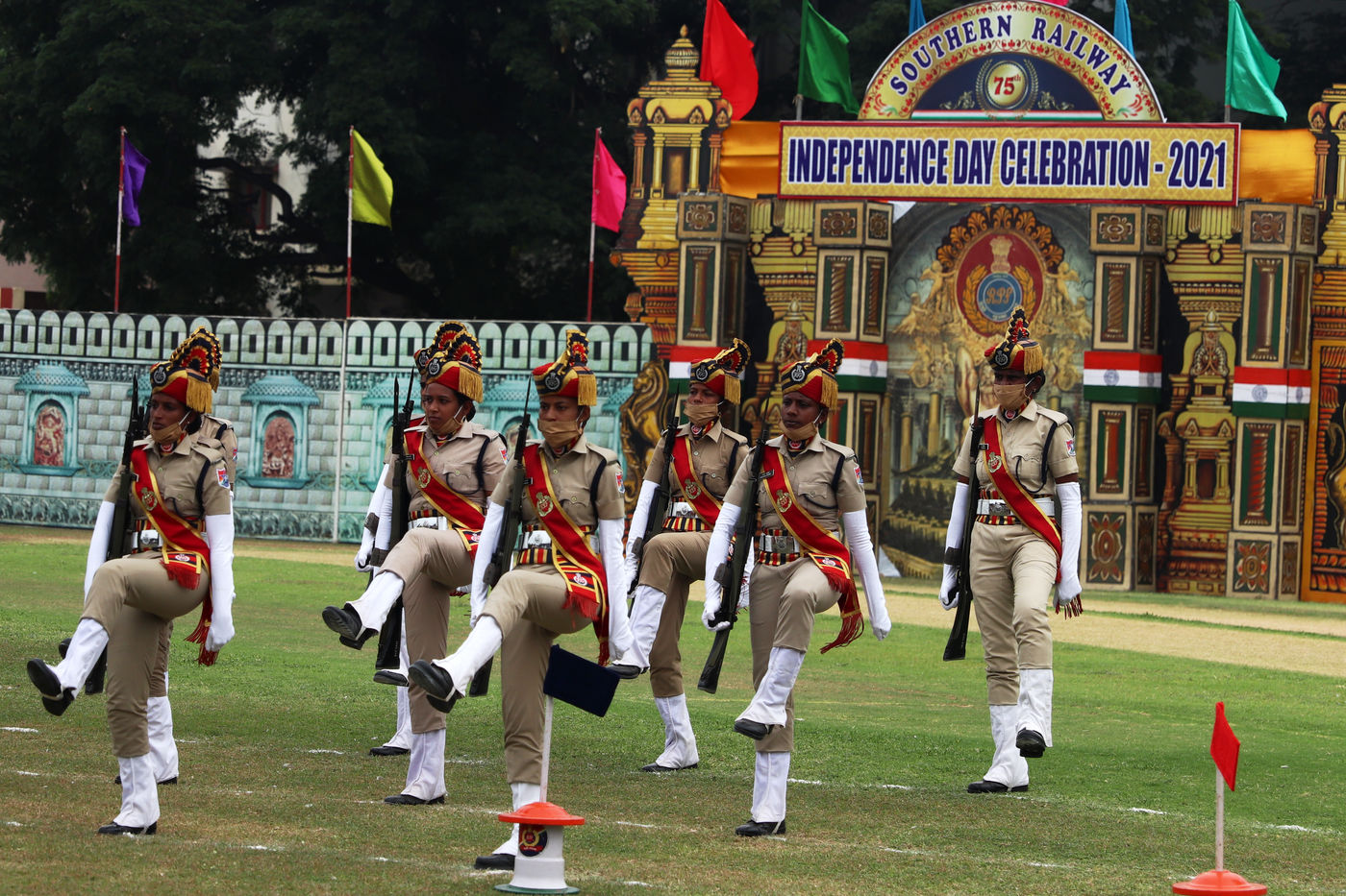Inde, Chennai, 2021-08-15. Les cadets de la Force de protection des chemins de fer (FPR) participent a un defile lors des celebrations du 75e jour de l independance de l Inde a Chennai. L Inde celebre son anniversaire de l independance de la domination coloniale britannique le 15 aout. Photographie de Sri Loganathan Velmurugan / Hans Lucas.