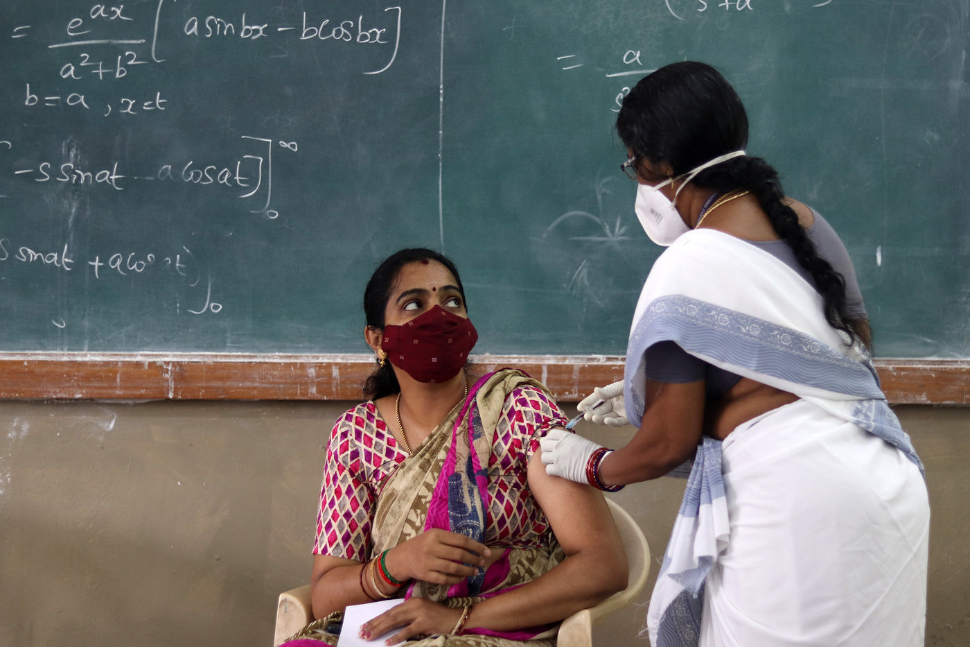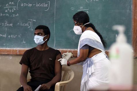 India, Chennai, 2021-09-06. A health worker inoculates a college student with a dose of Covishield, a Covid19 coronavirus vaccine during a vaccination camp on a college campus in Chennai. Following a slight decrease in COVID-19 cases, the Tamil Nadu State Government has allowed schools and colleges to reopen with certain COVID-19 guidelines. Photograph by Sri Loganathan Velmurugan / Hans Lucas.