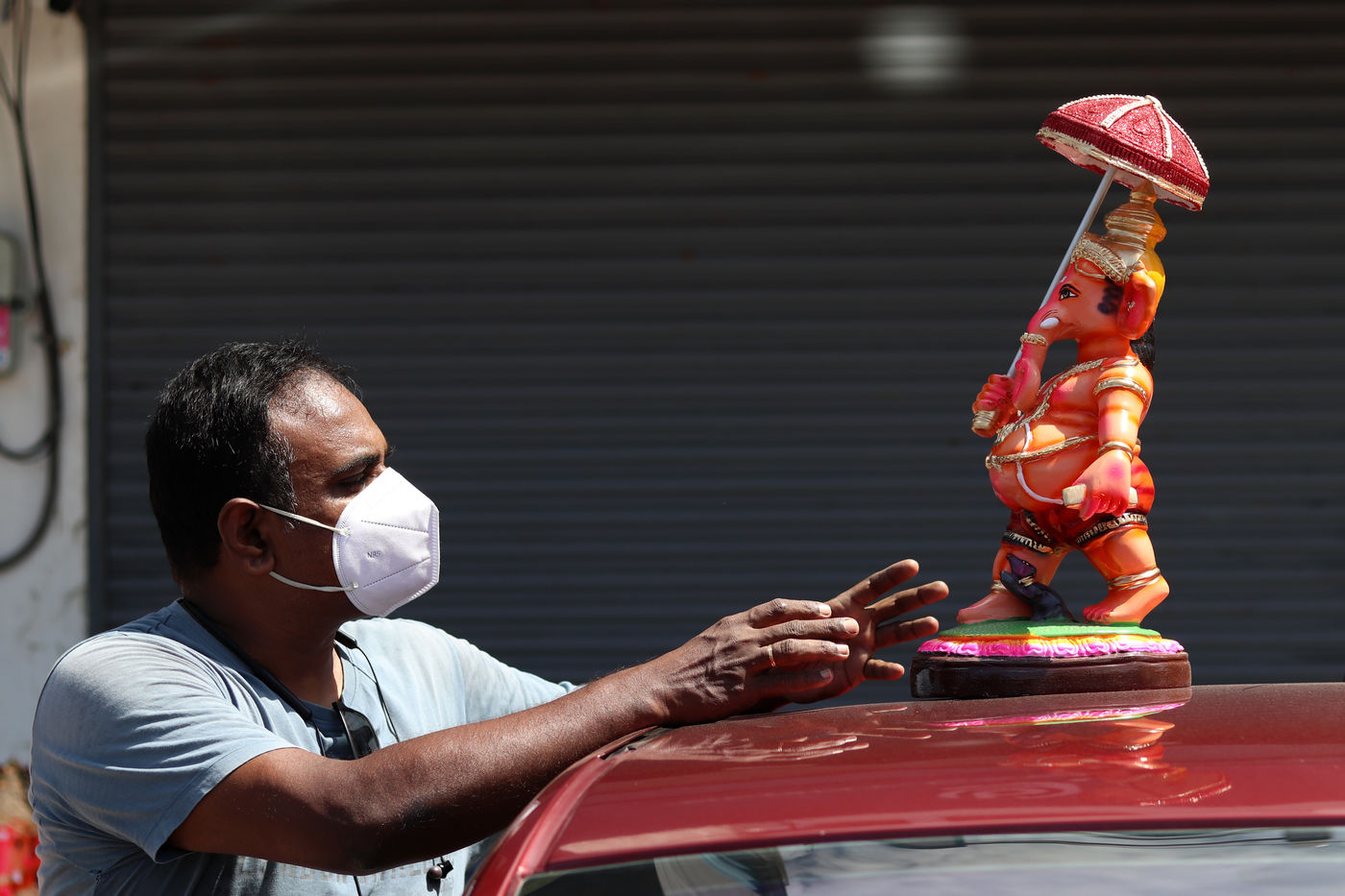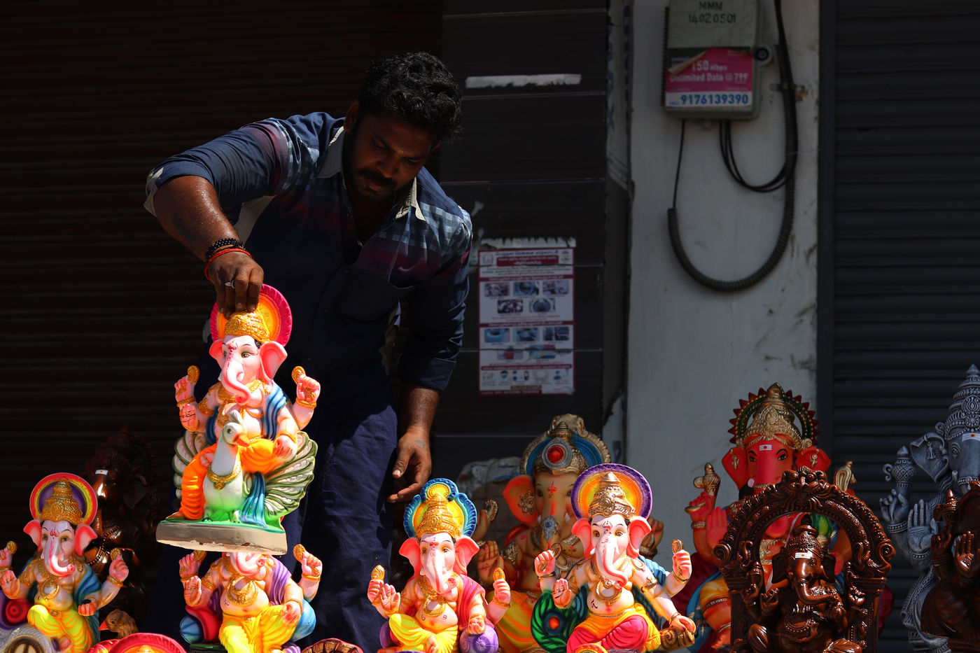 India, Chennai, 2021-09-09. A vendor arranging the idols of the elephant-headed Hindu god Ganesha, waits for customers on the eve of the Ganesh Chaturthi festival in Chennai. Photograph by Sri Loganathan Velmurugan / Hans Lucas