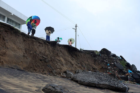 India, Chennai, 2022-12-09. A man seen walking near the uprooted palm trees due to the high tides near the Mahabalipuram beach as Cyclone Mandous is expected to make landfall, in Mahabalipuram, near Chennai. Photograph by Sri Loganathan Velmurugan / Hans Lucas.