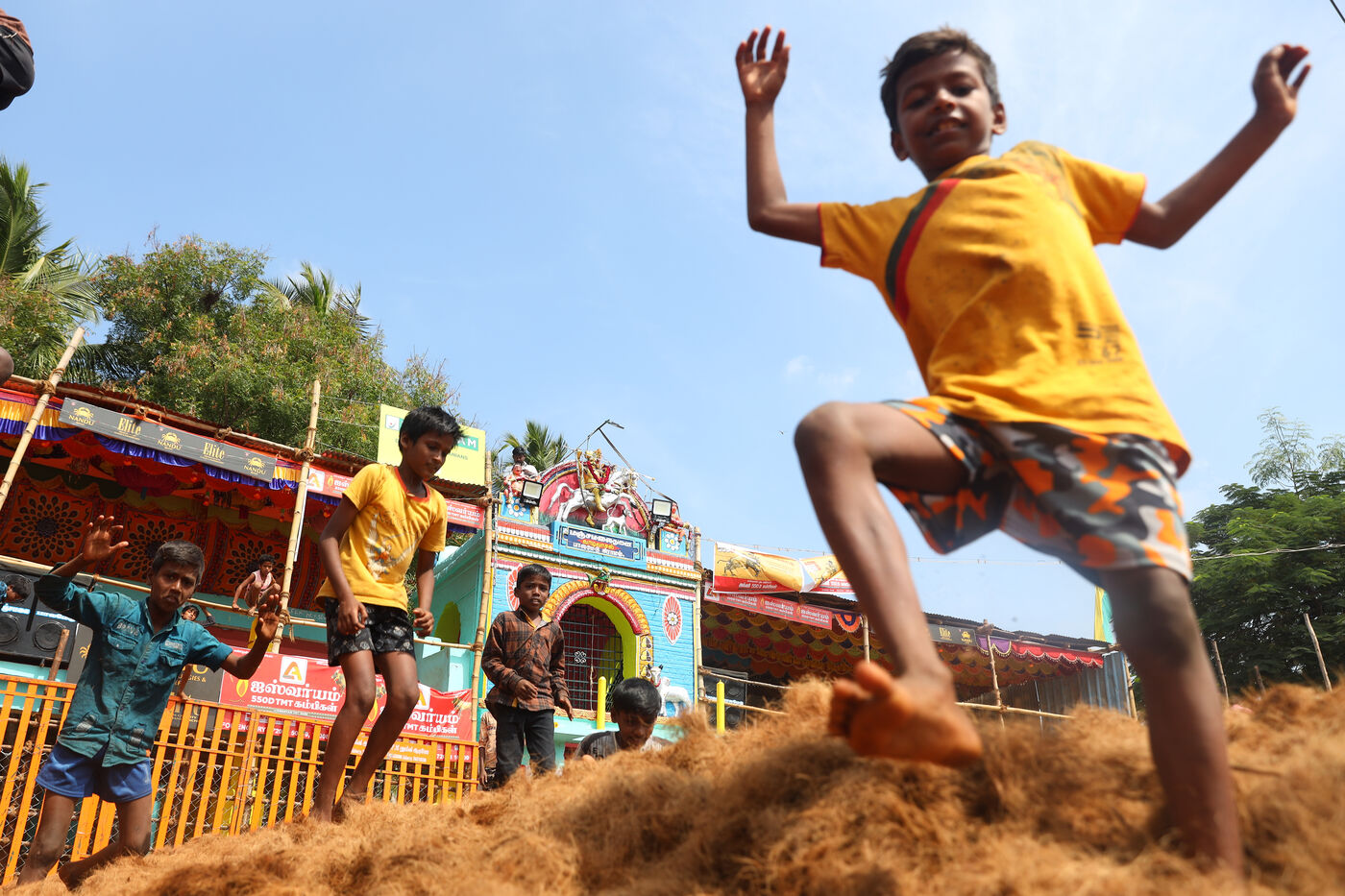 India, Madurai, 2023-14-01. Children play beside the Vadivasal established ahead of the traditional bull taming festival "Jallikkattu" in the village of Palemedu on the outskirts of Madurai in Tamilnadu. Jallikattu is a traditional Tamil bull taming sport that takes place during Pongal, a harvest festival in the Indian state of Tamil Nadu. Photograph by Sri Loganathan Velmurugan / Hans Lucas.