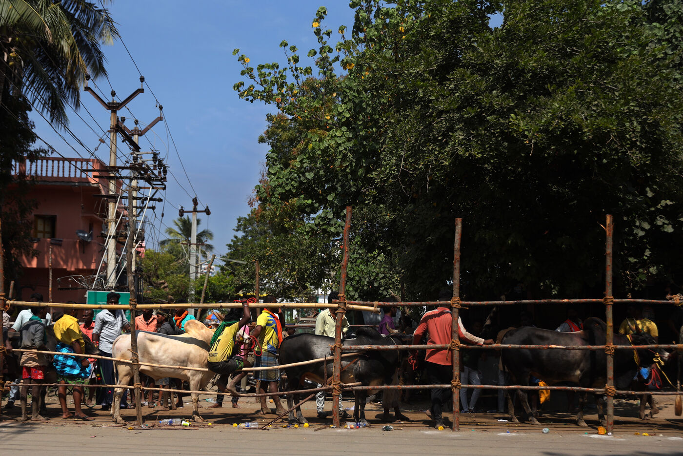Inde, Madurai, 2023-15-01. Un participant essaie de controler un taureau lors du festival traditionnel annuel d'apprivoisement des taureaux "Jallikkattu" dans le village de Avaniyapuram a la peripherie de Madurai dans le Tamilnadu. Jallikattu est un sport traditionnel tamoul d'apprivoisement de taureaux qui se deroule pendant Pongal, une fete des recoltes dans l'Etat indien du Tamil Nadu. Photographie de Sri Loganathan Velmurugan / Hans Lucas.