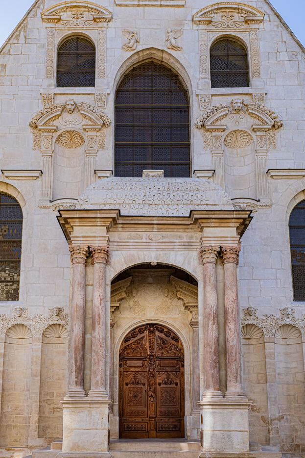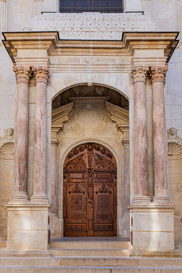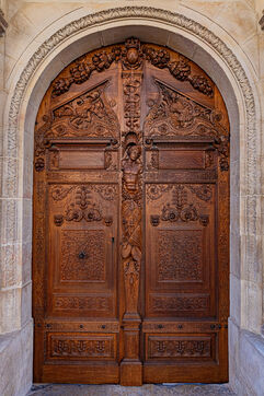 One of the edifice's major works of art is its carved wooden door, which is a faithful copy of the original work by Hughes Sambin (kept in the reserves of Dijon's Musée des Beaux-Arts), executed by M. Vassal of Paris around 1903. This large, arched door, made up of two panels, gave access to the great hall of the Palais du Parlement built in 1572 by Hugues Brouhée.