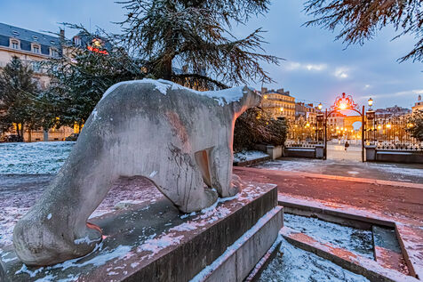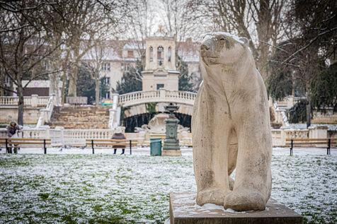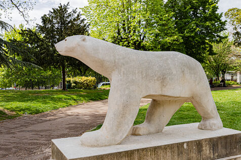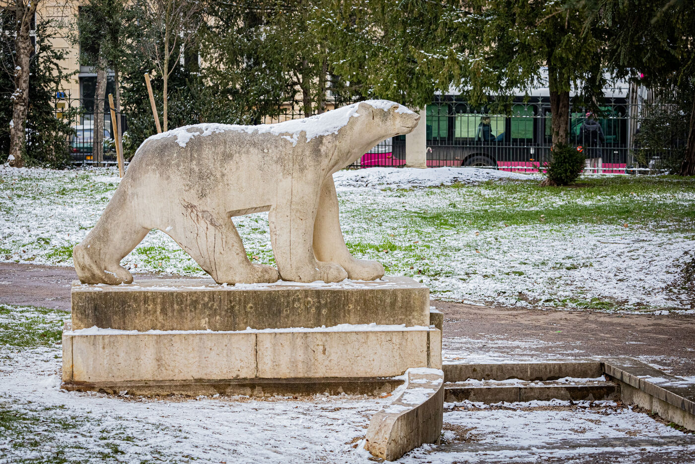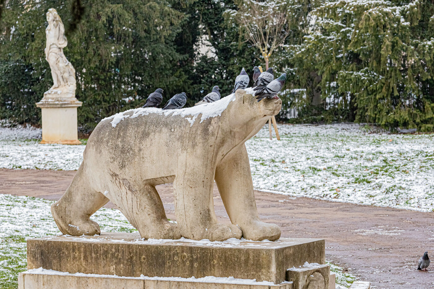 The Pompon bear in Dijon's Darcy garden is wrapped in the soft white of a winter landscape and freshly fallen snow. Then, in spring 2024, it regained its white colour following cleaning using essential oils in compliance with Ecojardins label standards.