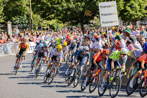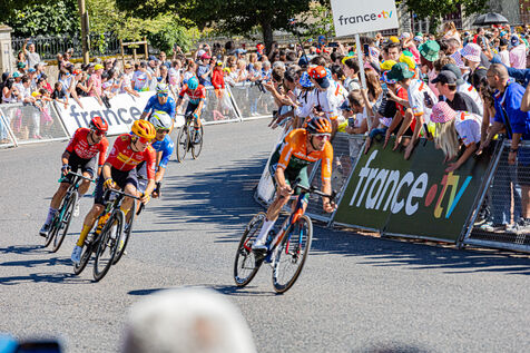At the finish of stage 6 of the Tour de France 2024 in Dijon, the riders are in the thick of the final turn before the final sprint.