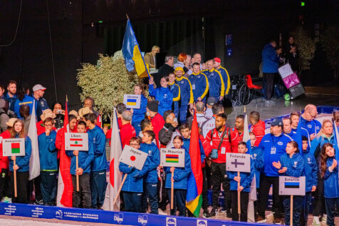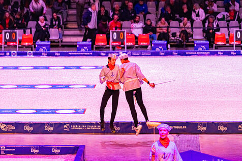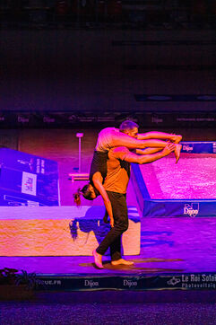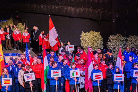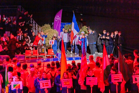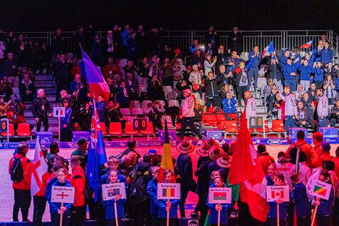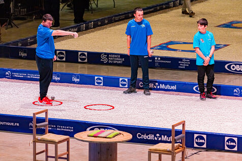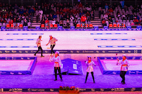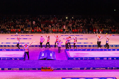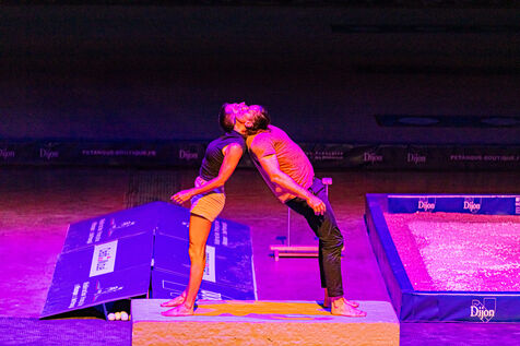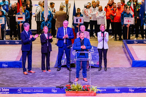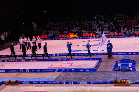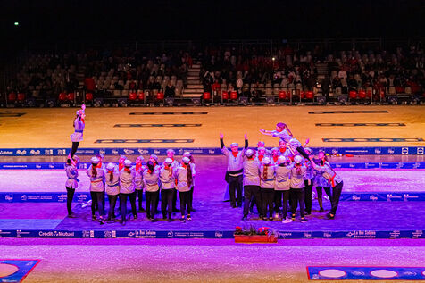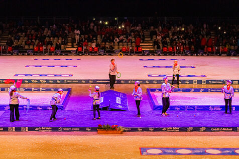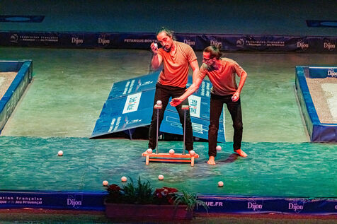 Cérémonie d'ouverture du championnat du monde de pétanque 2024 au zénith de Dijon. Présentation des équipes, des arbitres, discours officiels, spectacle de cirque, jongleries, démonstration, la Fédération Française de Pétanque et Jeu Provencal (FFPJP) a mis les petits plats dans les grands pour assurer le spectacle avant le début de la compétition.