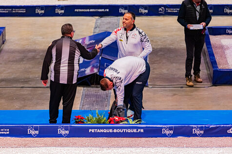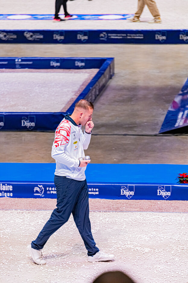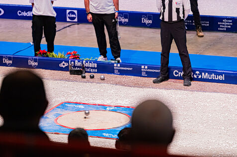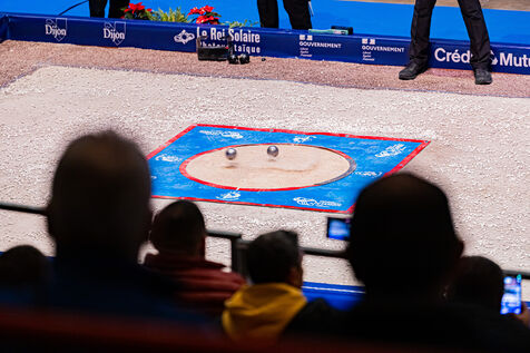 Precision shooting the qualifications with Dylan Rocher at the 2024 World Petanque Championship at the Zenith in Dijon. Illustrations and choreography typical of this discipline. An event that will see Dylan Rocher score only 25 points, narrowly sending him to the repechage, from where he will be eliminated while he was the favorite of the competition, missing his chance to win this event for the 4th time in a row.