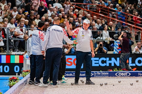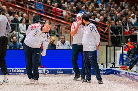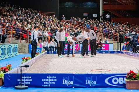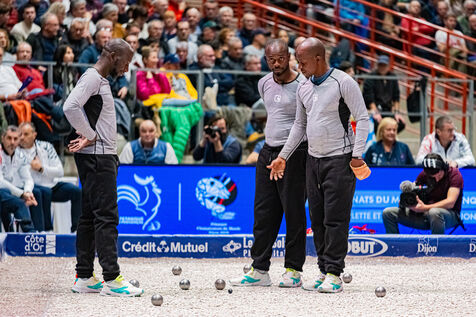 The French team at work at the 2024 World Petanque Championship in Dijon, during the 8th final played against Mali where it won 13 to 0, a beautiful "Fanny". It is composed of Philippe Suchaud, Dylan Rocher, Henri Lacroix and Jean Feltain, trained by David Le Dantec.