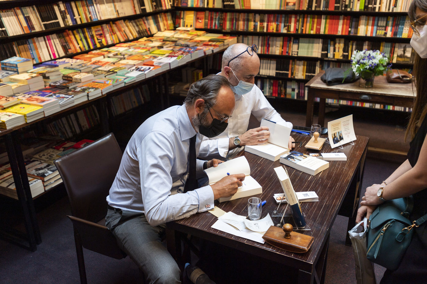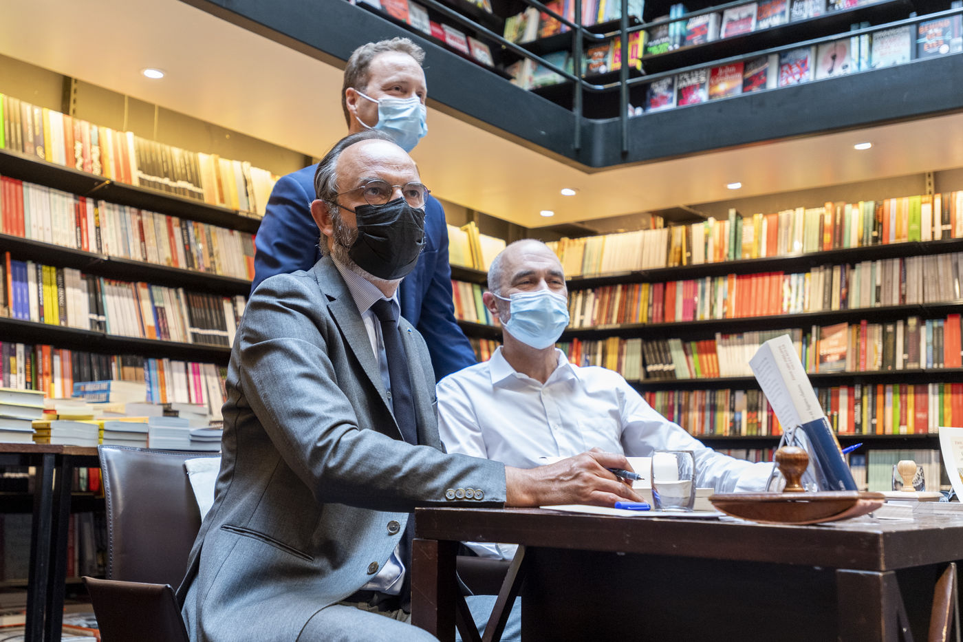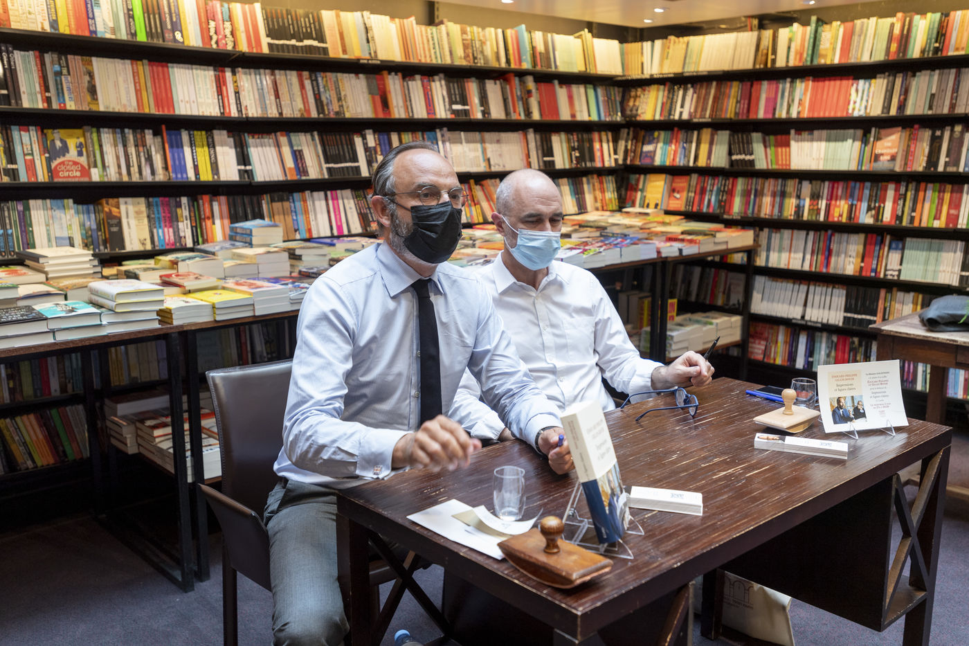 Former Prime Minister and current Mayor of Le Havre, Edouard Philippe and Gilles Boyer sign their book "Impressions et lignes claires
