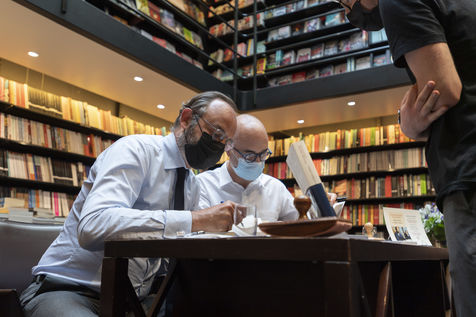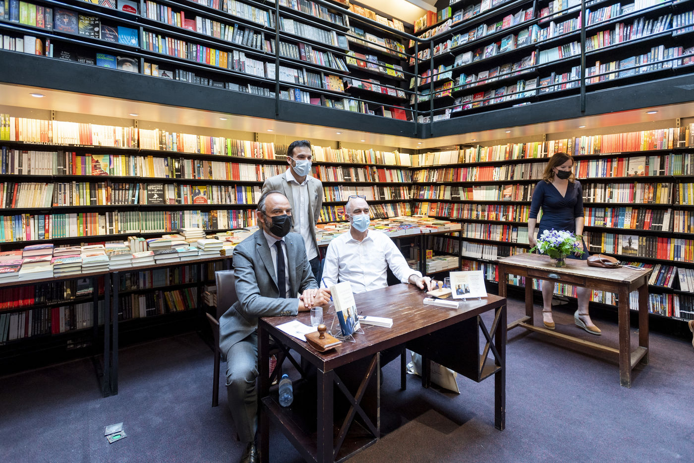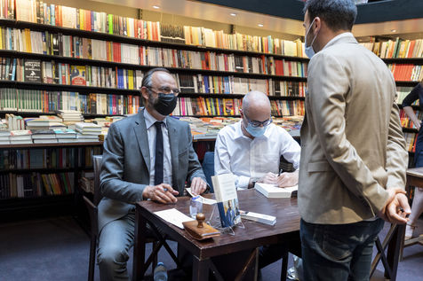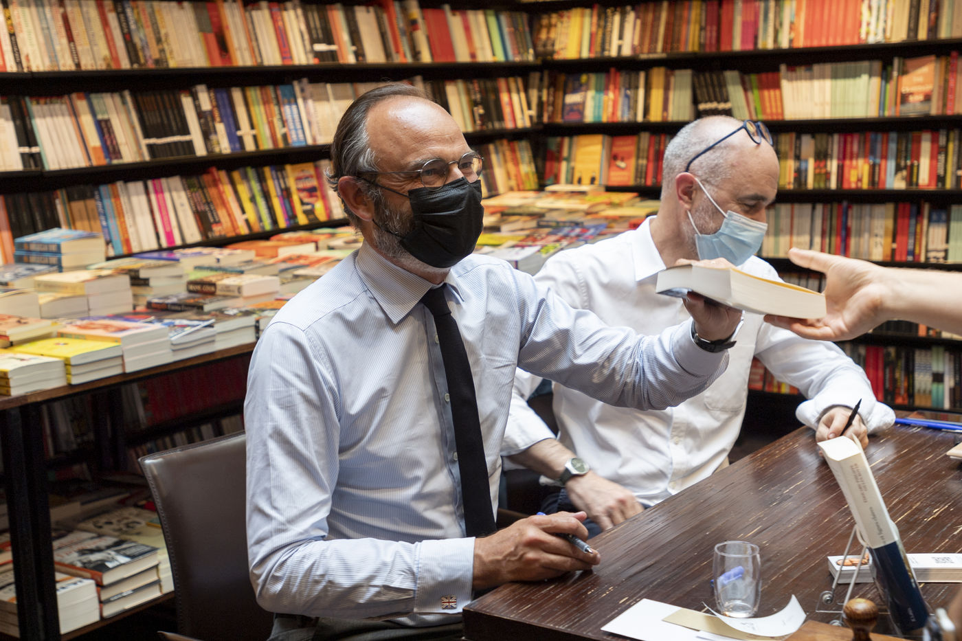Former Prime Minister and current Mayor of Le Havre, Edouard Philippe and Gilles Boyer sign their book "Impressions et lignes claires