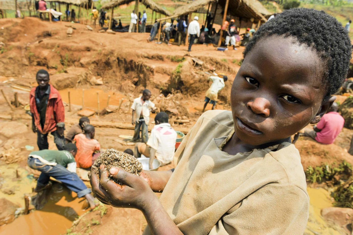 Gold mine in South Kivu, DRC Congo. Young miners at a processing site where they break and ground down gold ore, mix it with water, and extract the gold. Murale, South Kivu, DRC. August 2010.